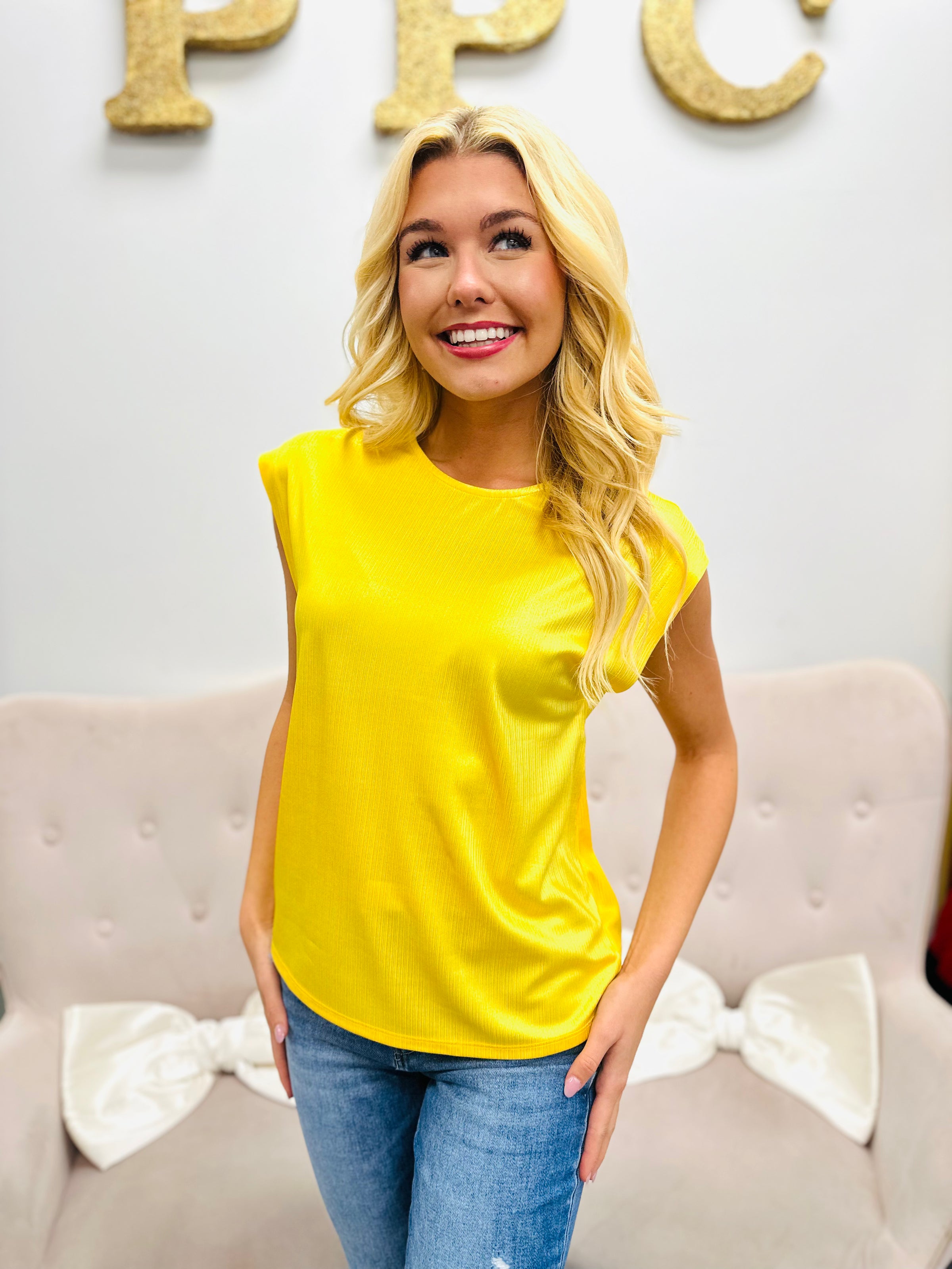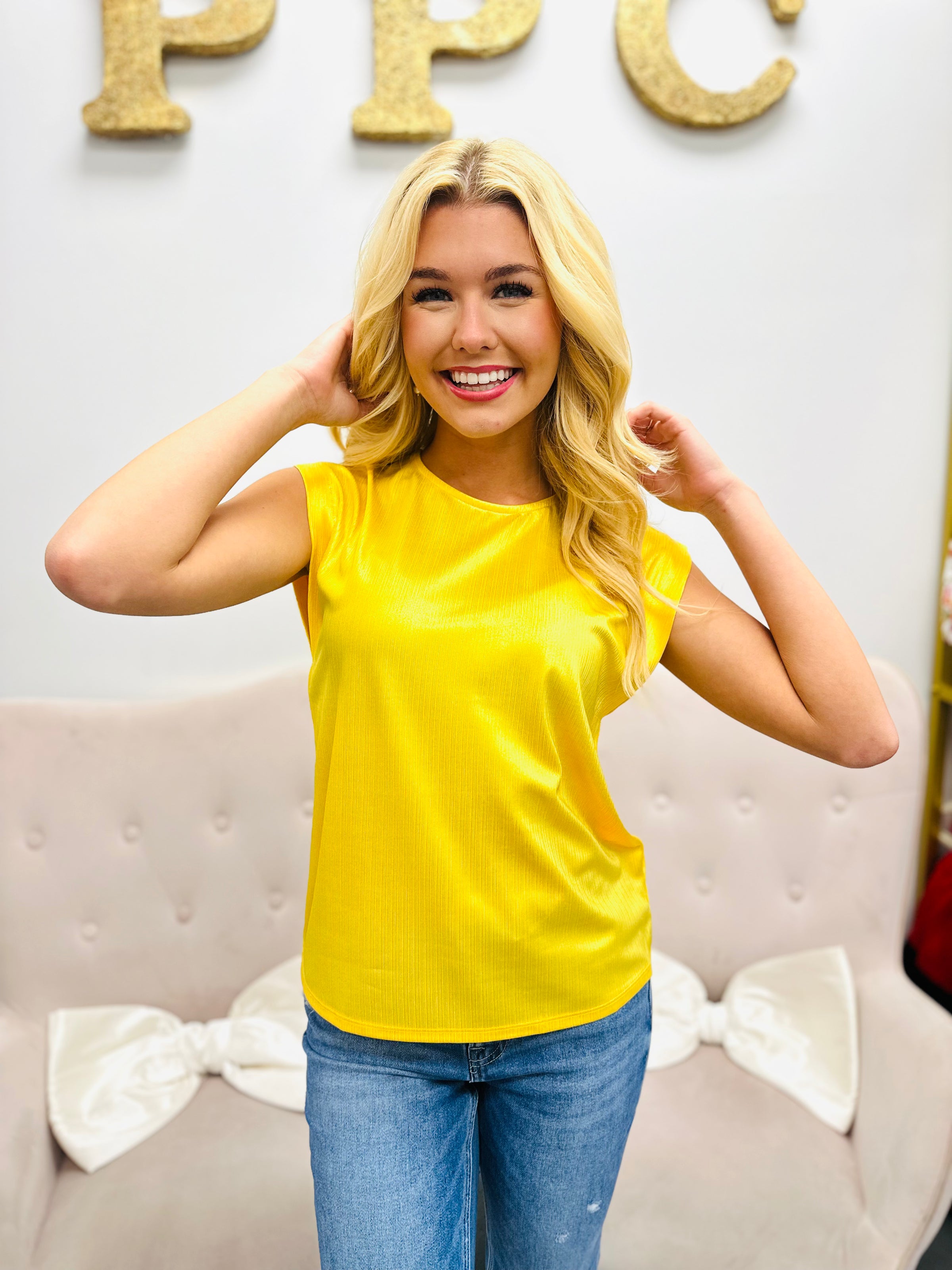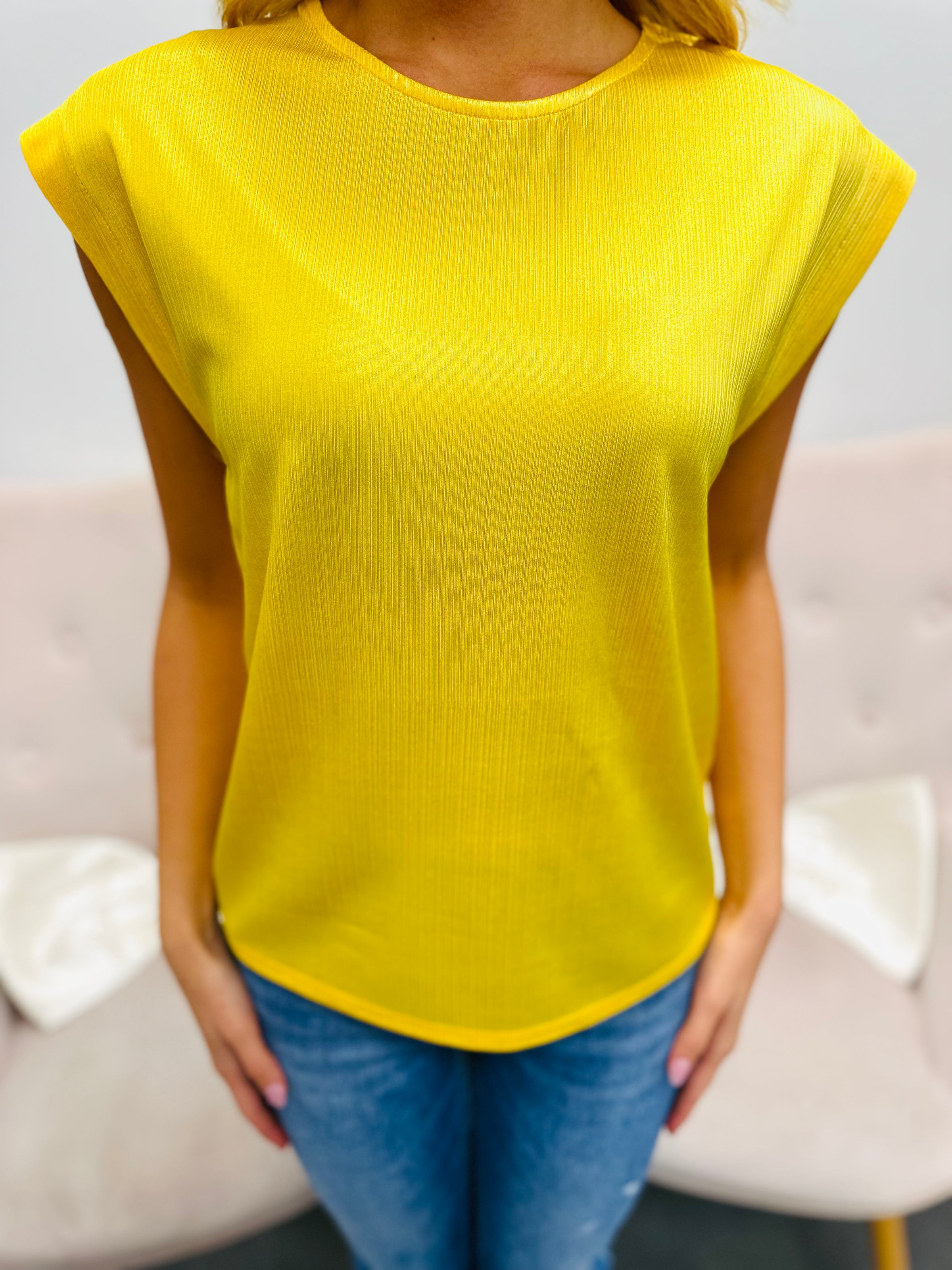 Add a splash of sunshine to your wardrobe with this yellow sleeveless metallic top. Its shimmering fabric catches the light perfectly, making it a fun and flirty choice for parties or a night out. Lightweight and sleeveless, it keeps you cool while turning heads in style. Perfect for mixing and matching, this top brings a playful glow to any outfit.