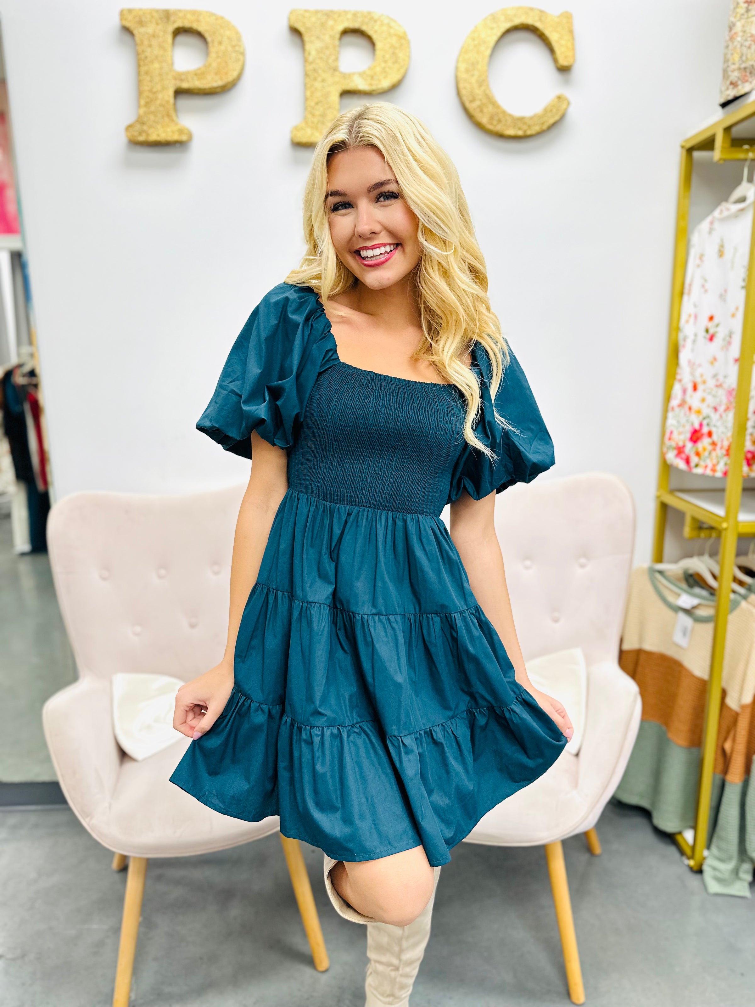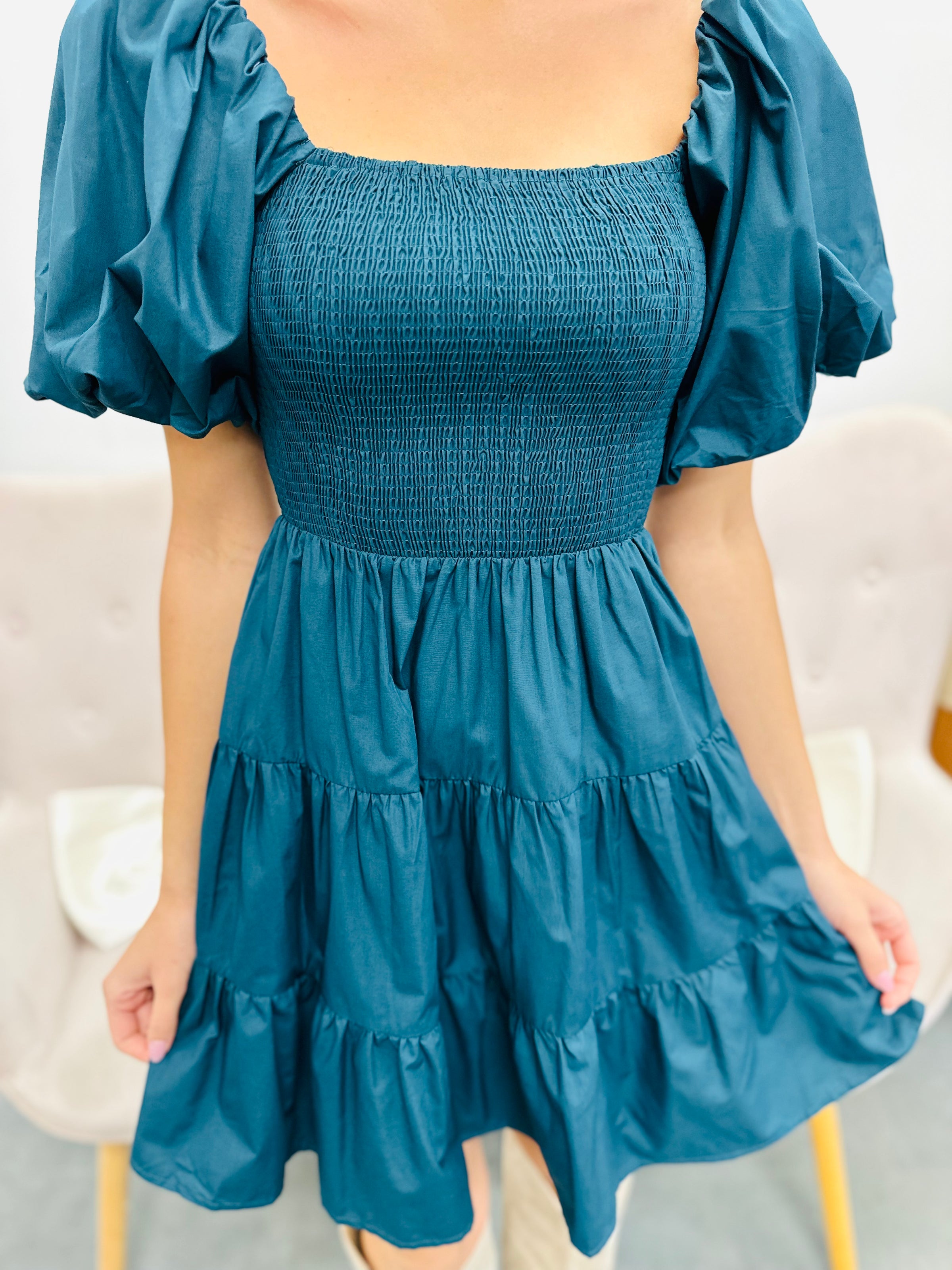 Step into style with our smocked puff sleeve dress! The square neckline and tiered design create a flattering silhouette, while the smocking at front and back adds a unique touch. Lined, lightweight, and non-sheer, this woven mini dress is perfect for any occasion.