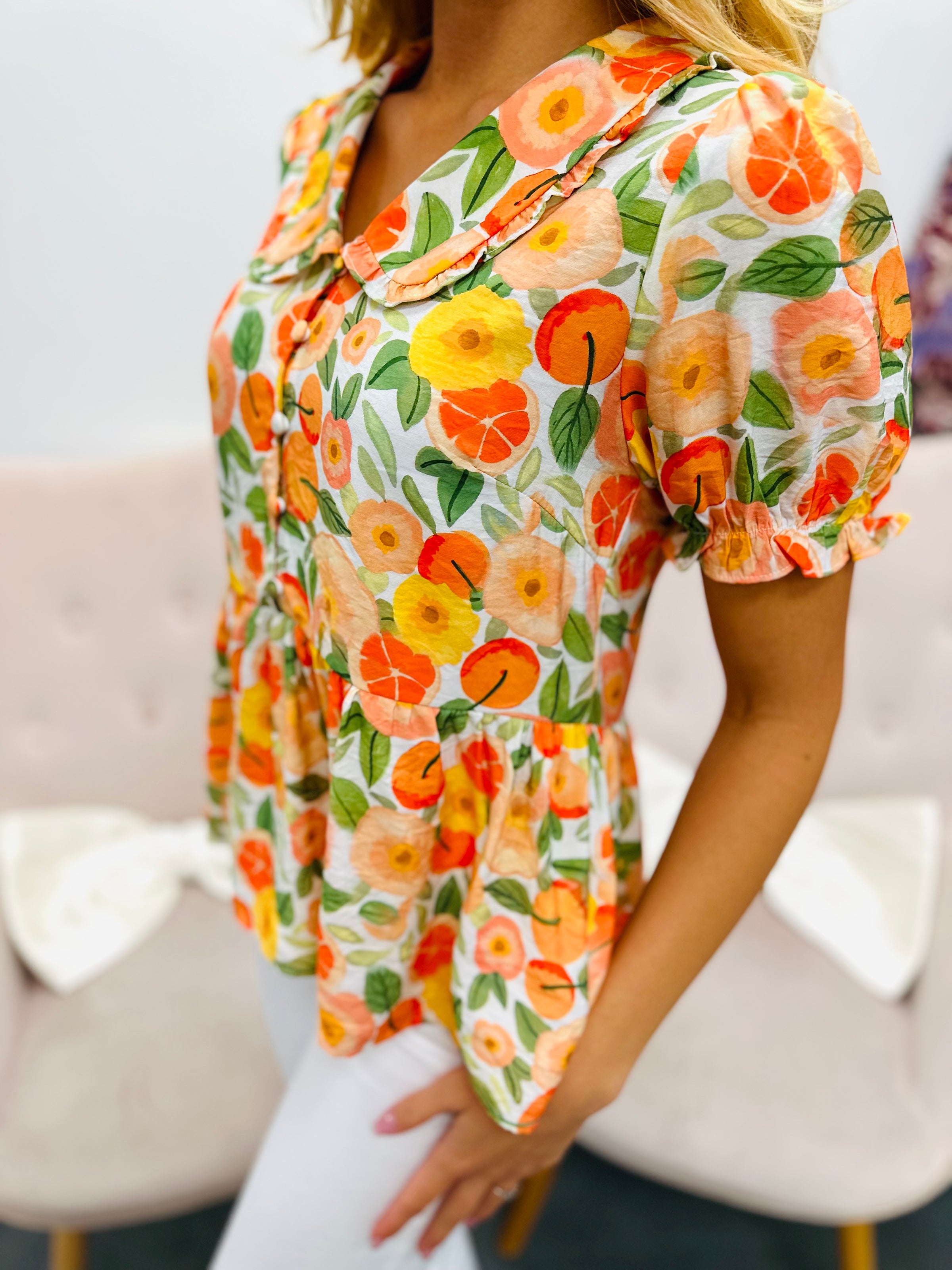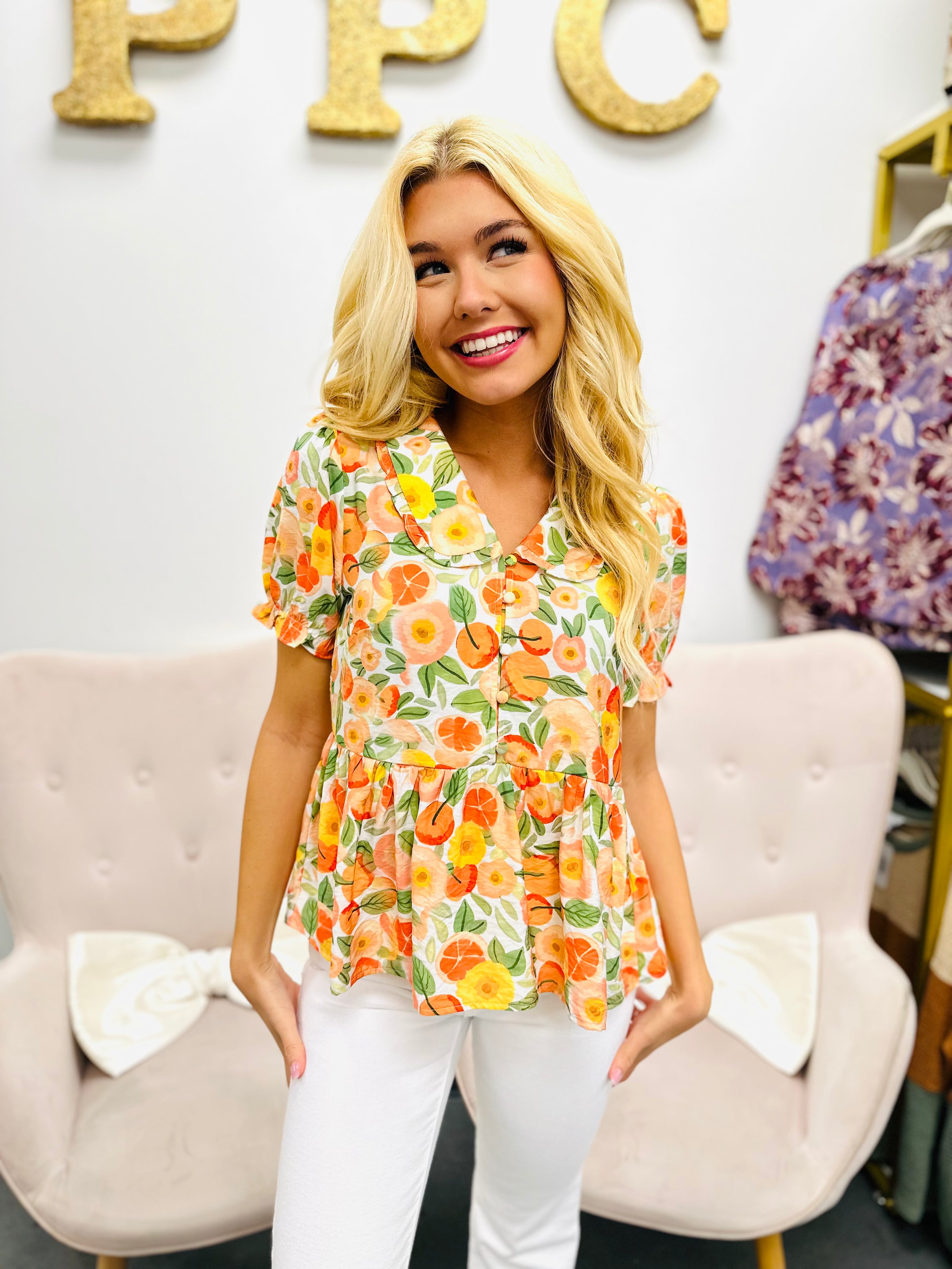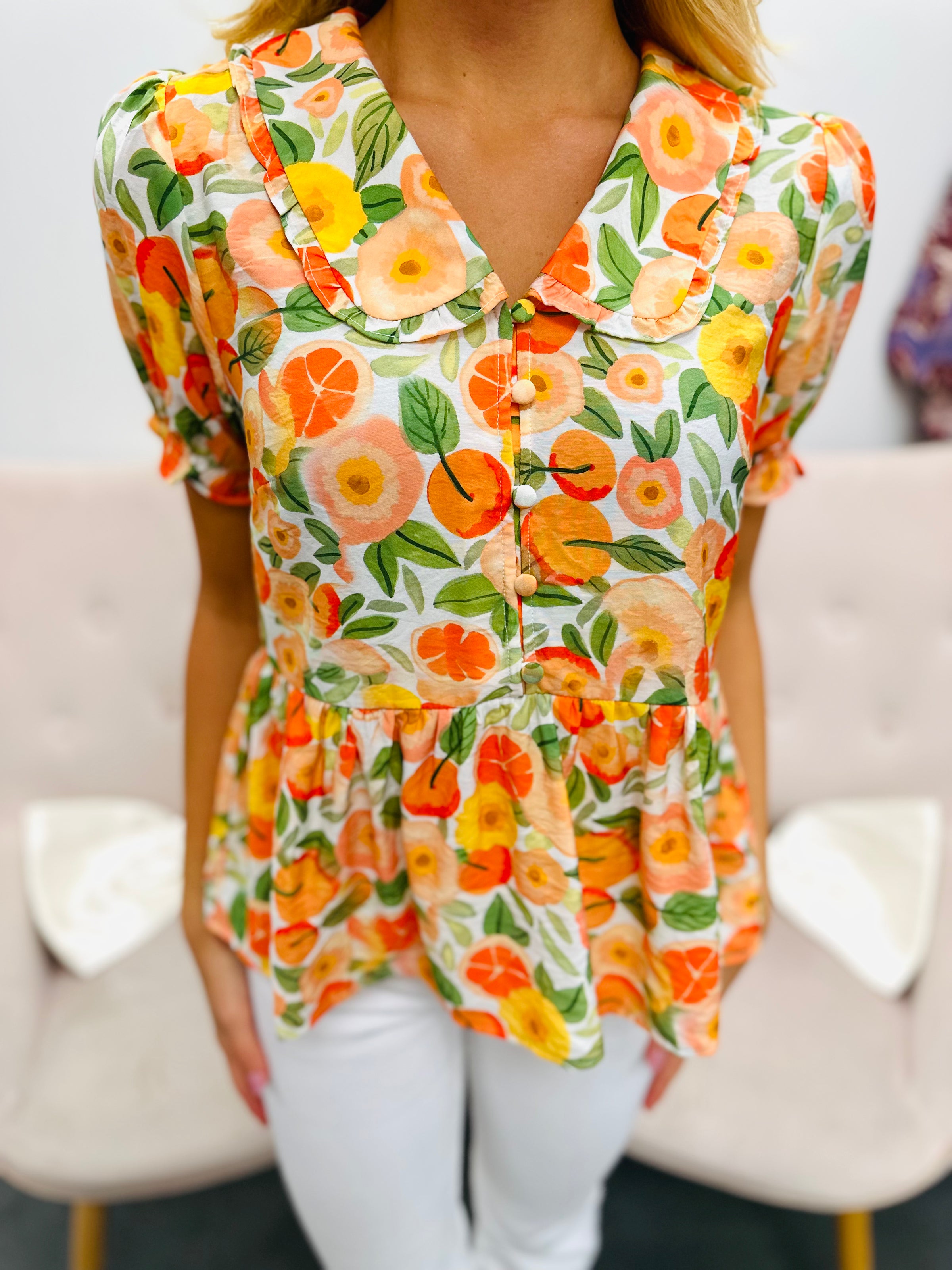 Add a pop of charm to your wardrobe with this playful short sleeve blouse featuring a vibrant floral print and a classic collar. Its breezy fabric keeps you comfy, while the fun design brightens up any outfit. Perfect for sunny days when you want to stand out with effortless style!