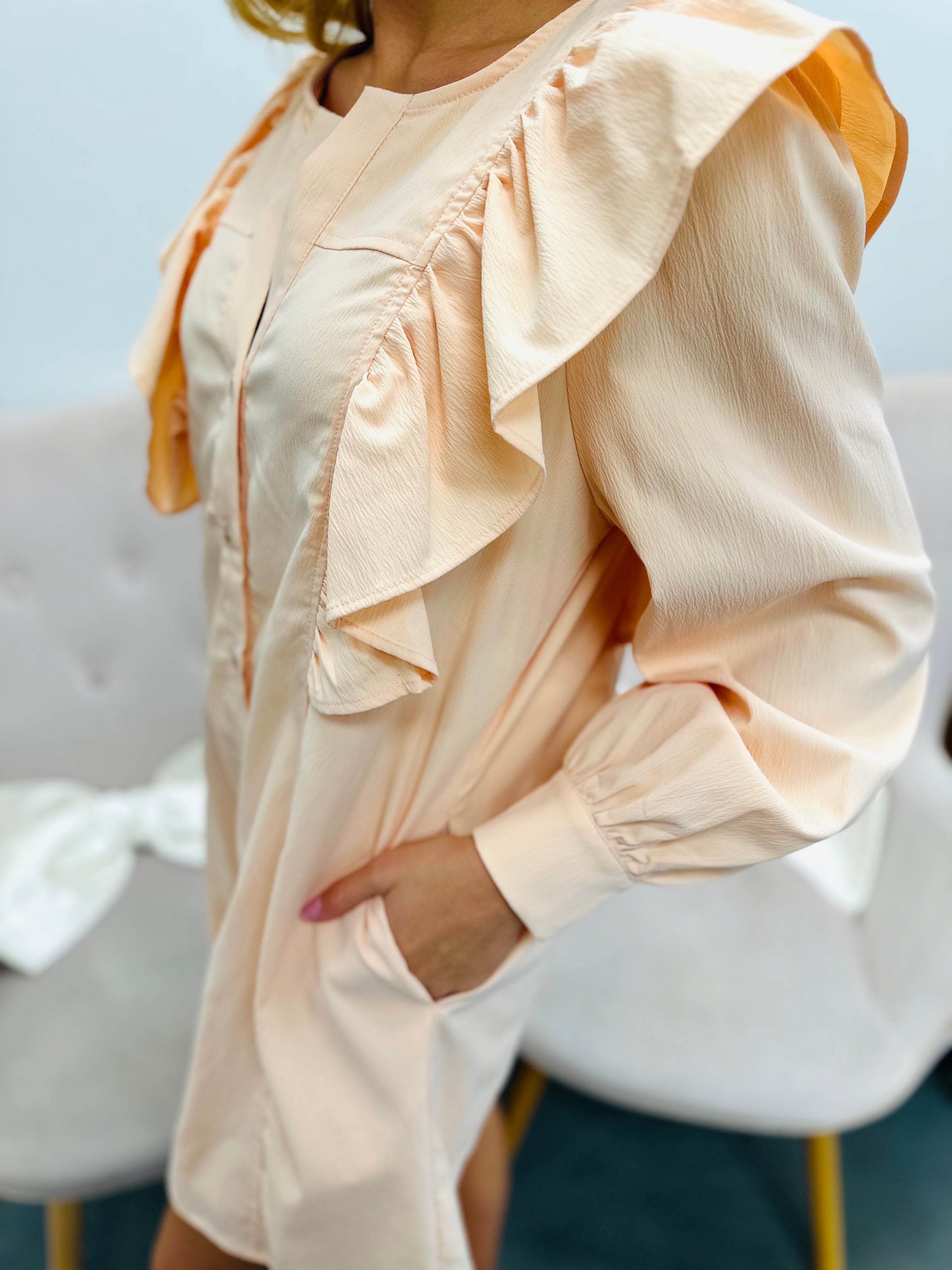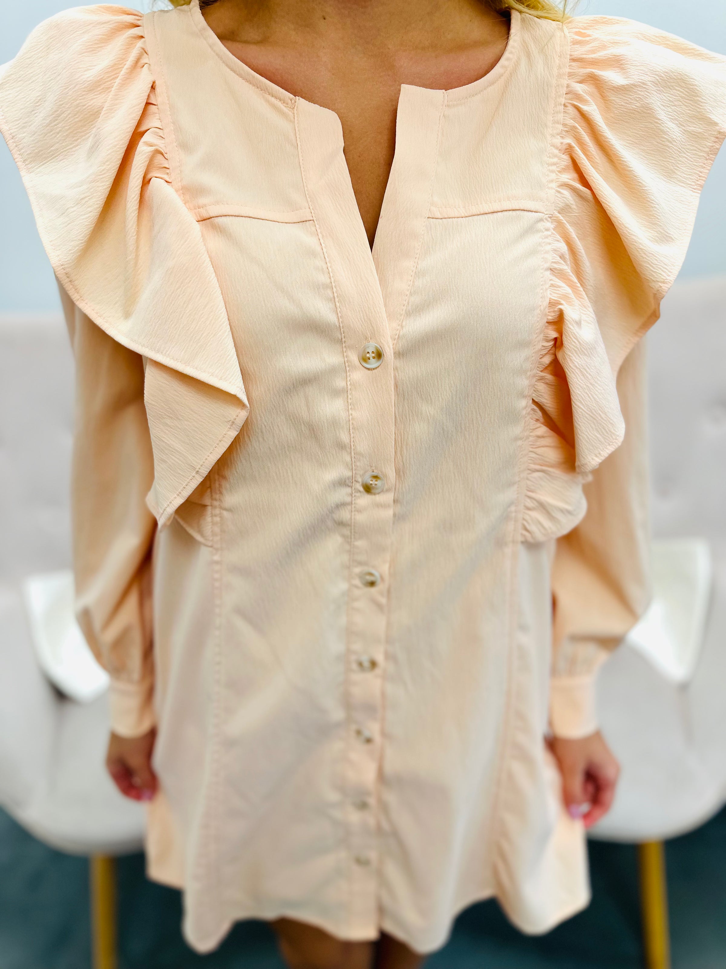 Step out in style with this playful v-neck button-front mini dress. Featuring ruffle details at the front and back, button closures at sleeves, and convenient pockets at the side. With its lightweight, non-sheer woven material, you'll be comfortable and fashionable all day long!