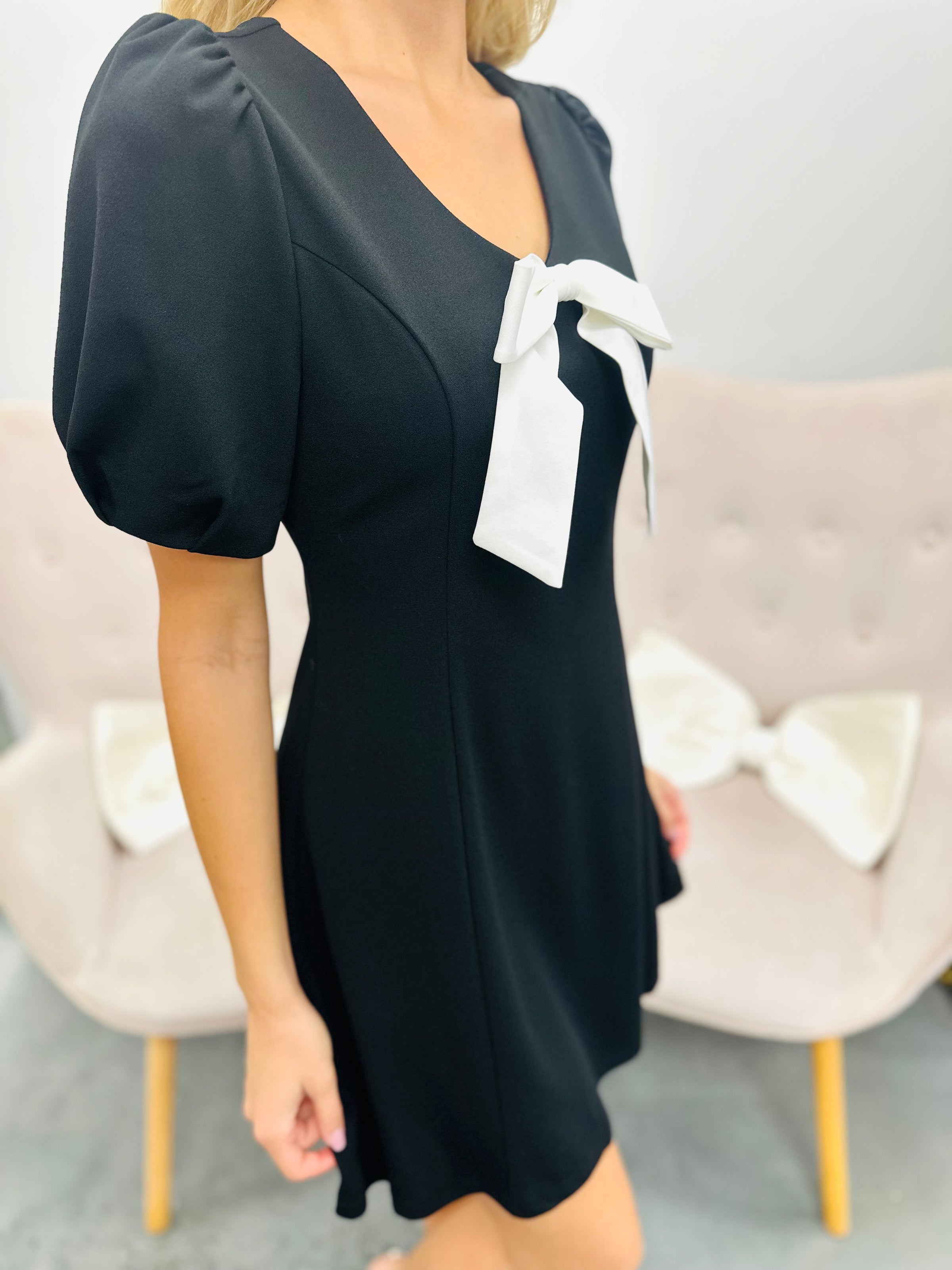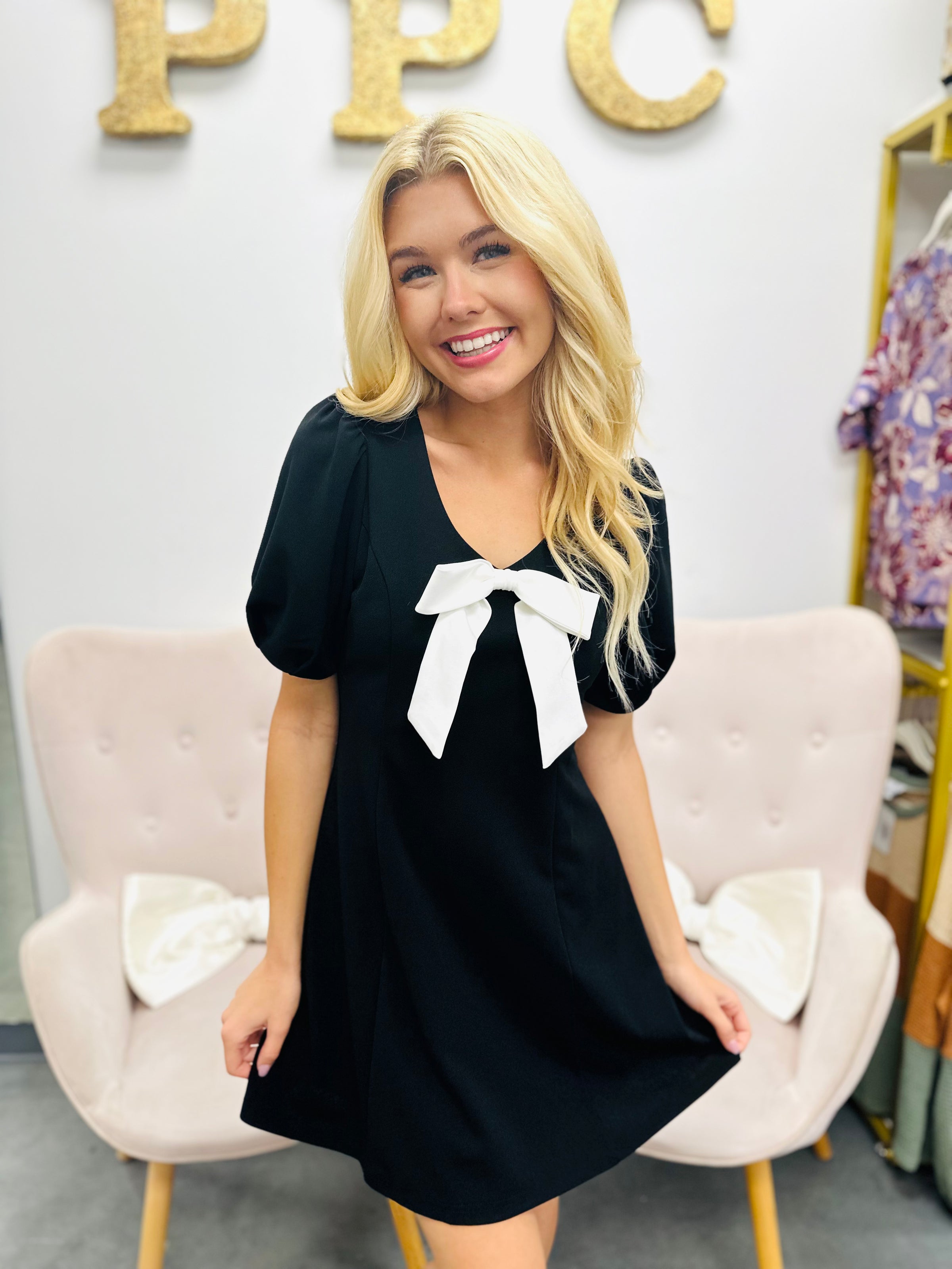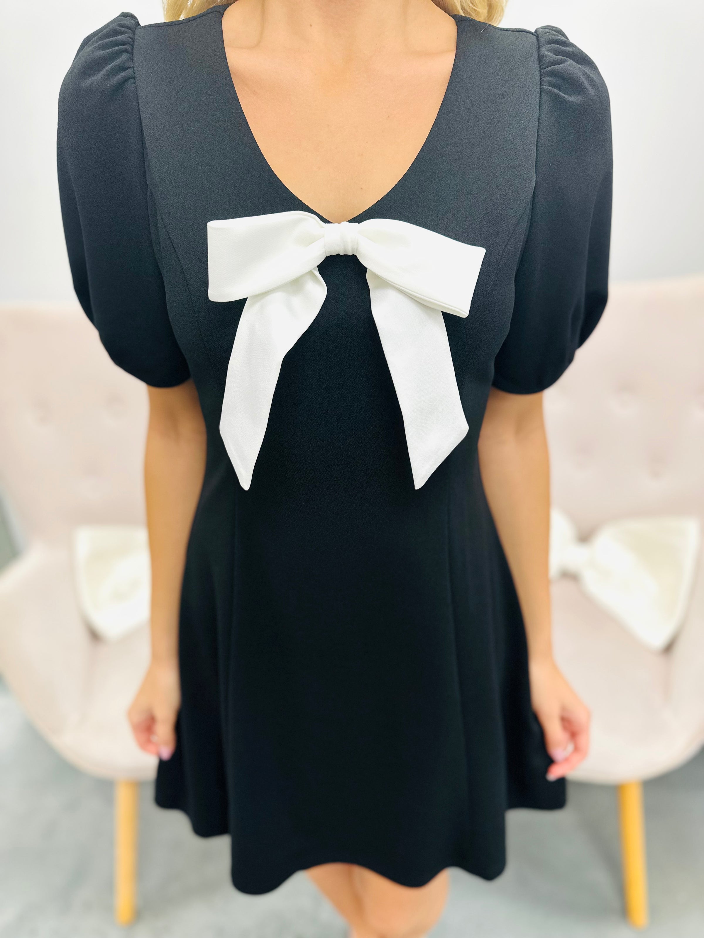 Liven up your wardrobe with this black V-neck dress, accented by a white bow at the front. The short sleeves provide a cool, comfortable fit, while the eye-catching bow brings a playful flair that works beautifully for both daytime outings and evening fun.