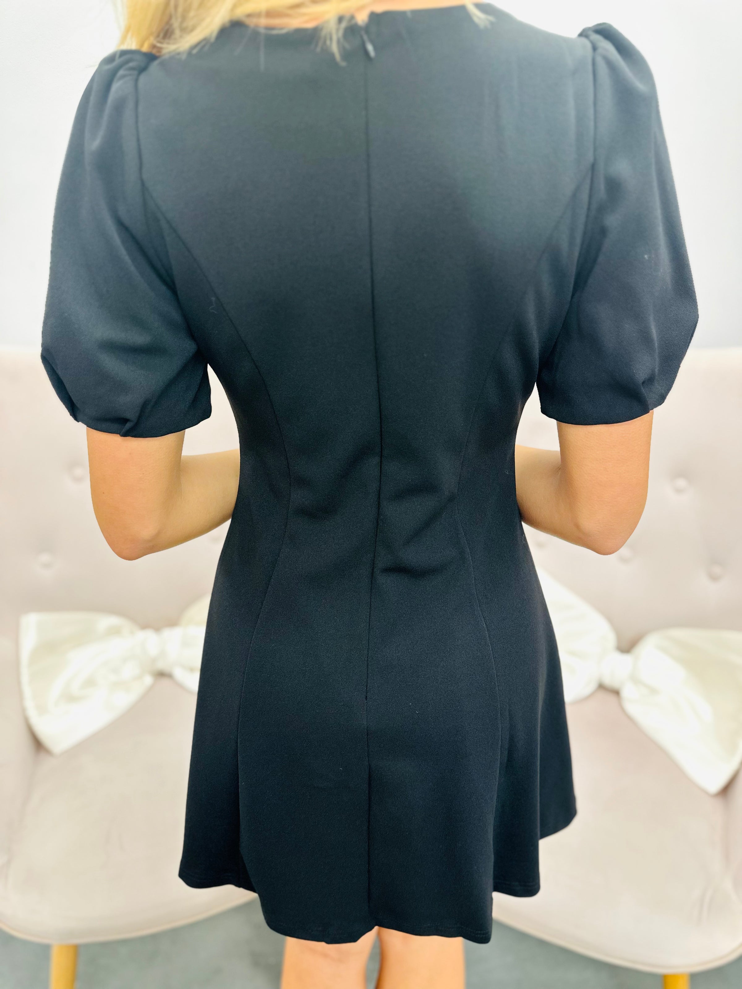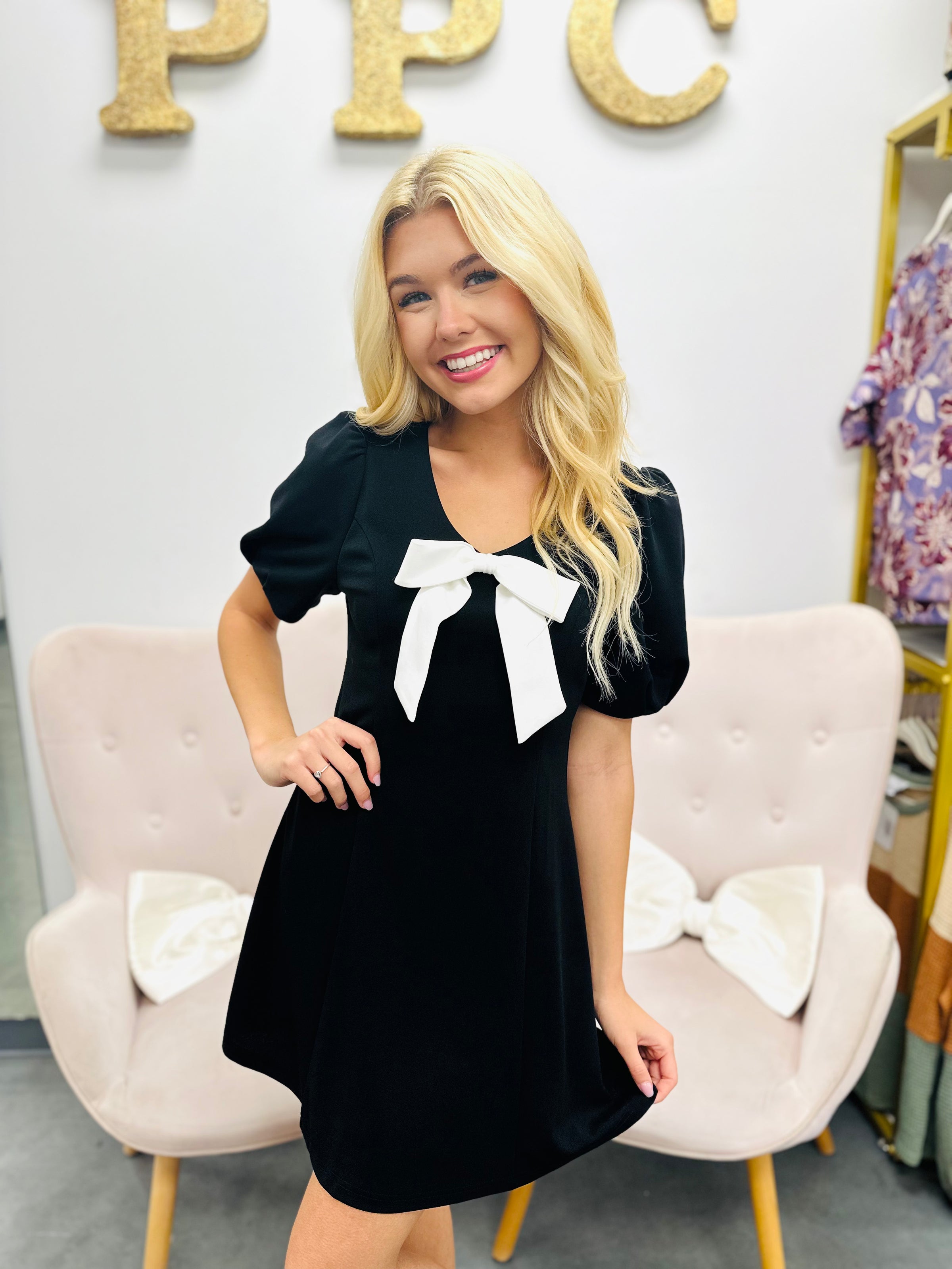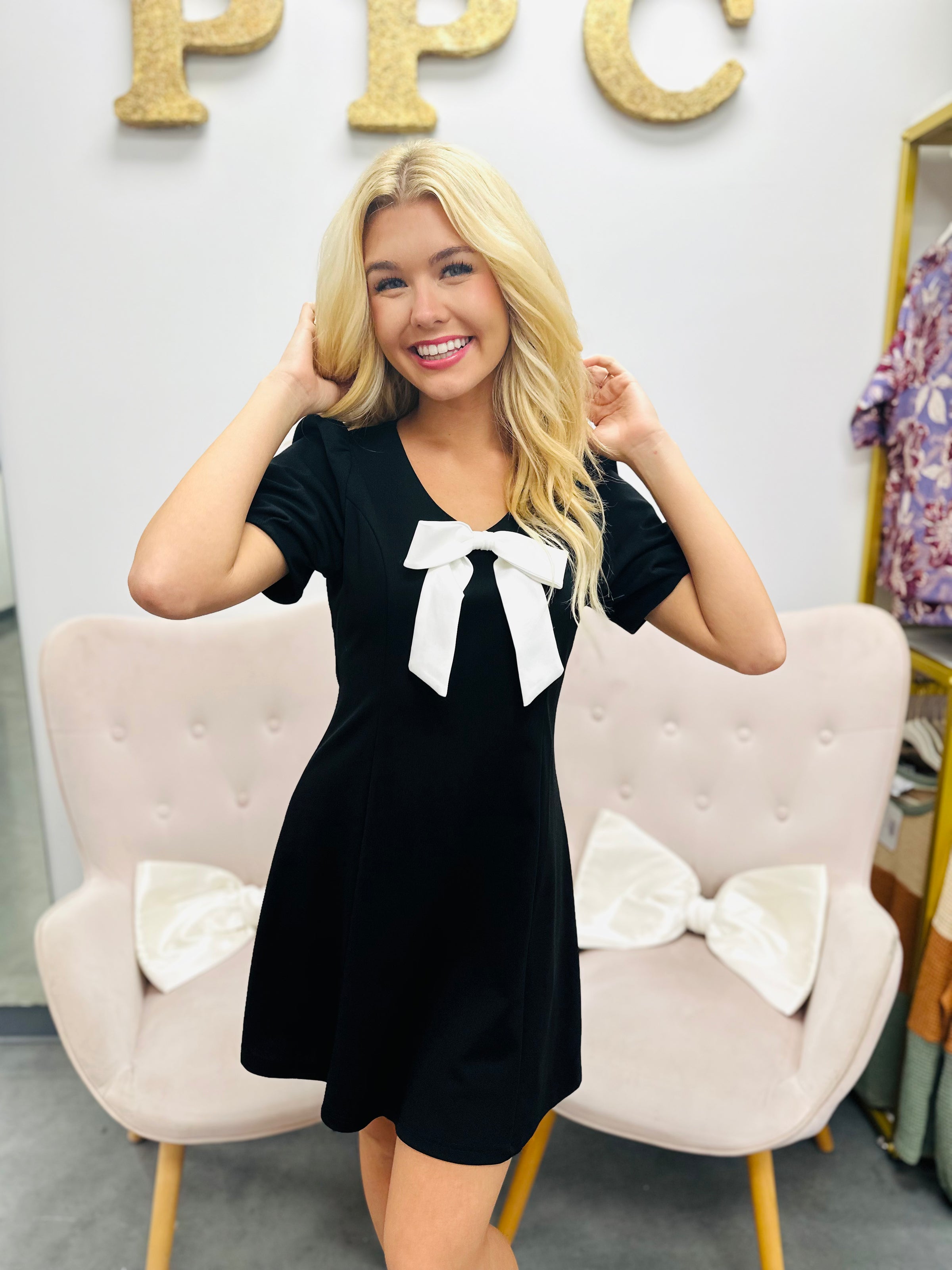 Liven up your wardrobe with this black V-neck dress, accented by a white bow at the front. The short sleeves provide a cool, comfortable fit, while the eye-catching bow brings a playful flair that works beautifully for both daytime outings and evening fun.