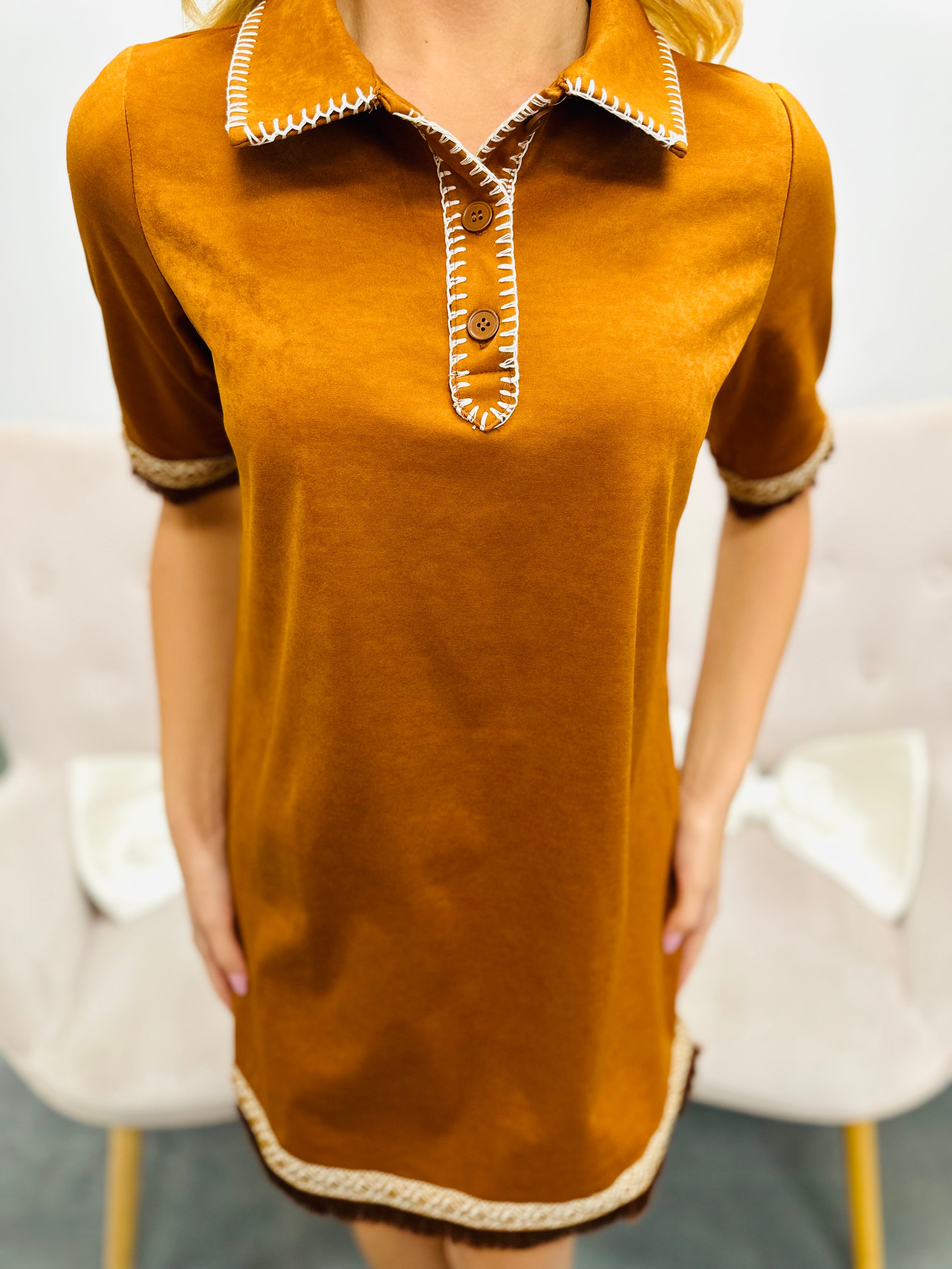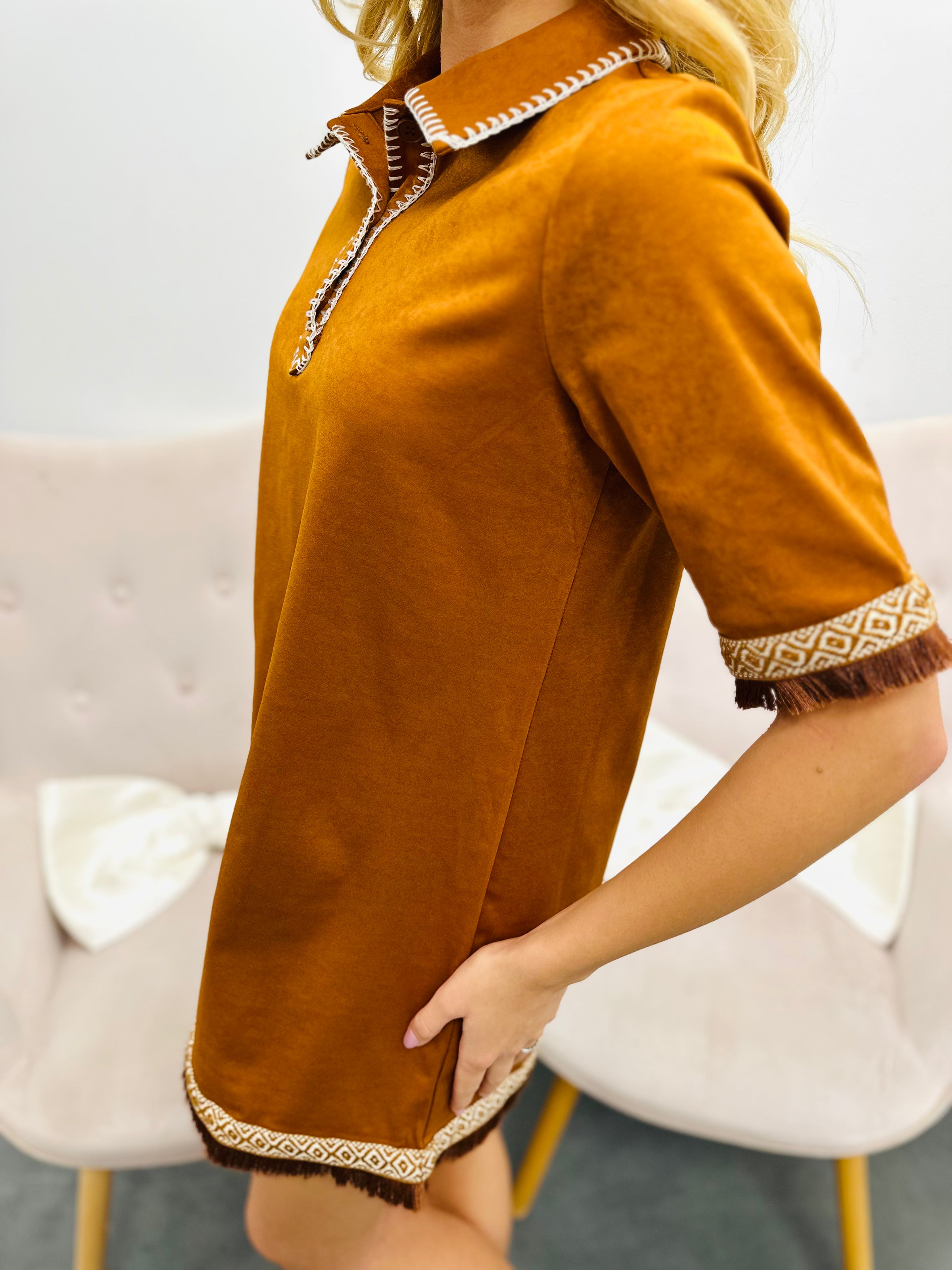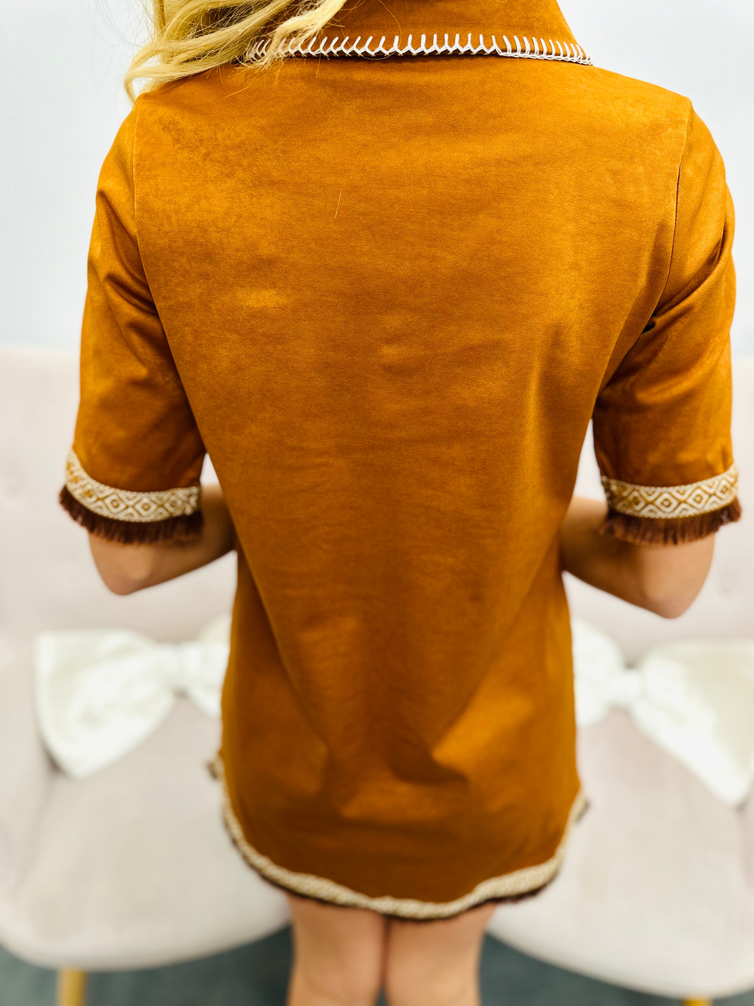 Step up your style game with our button-up suede dress! This unique piece boasts a collared neckline and fringe detail along the sleeve and hemline. Perfect for adding a touch of fun and quirkiness to any outfit. Go ahead, make a statement!