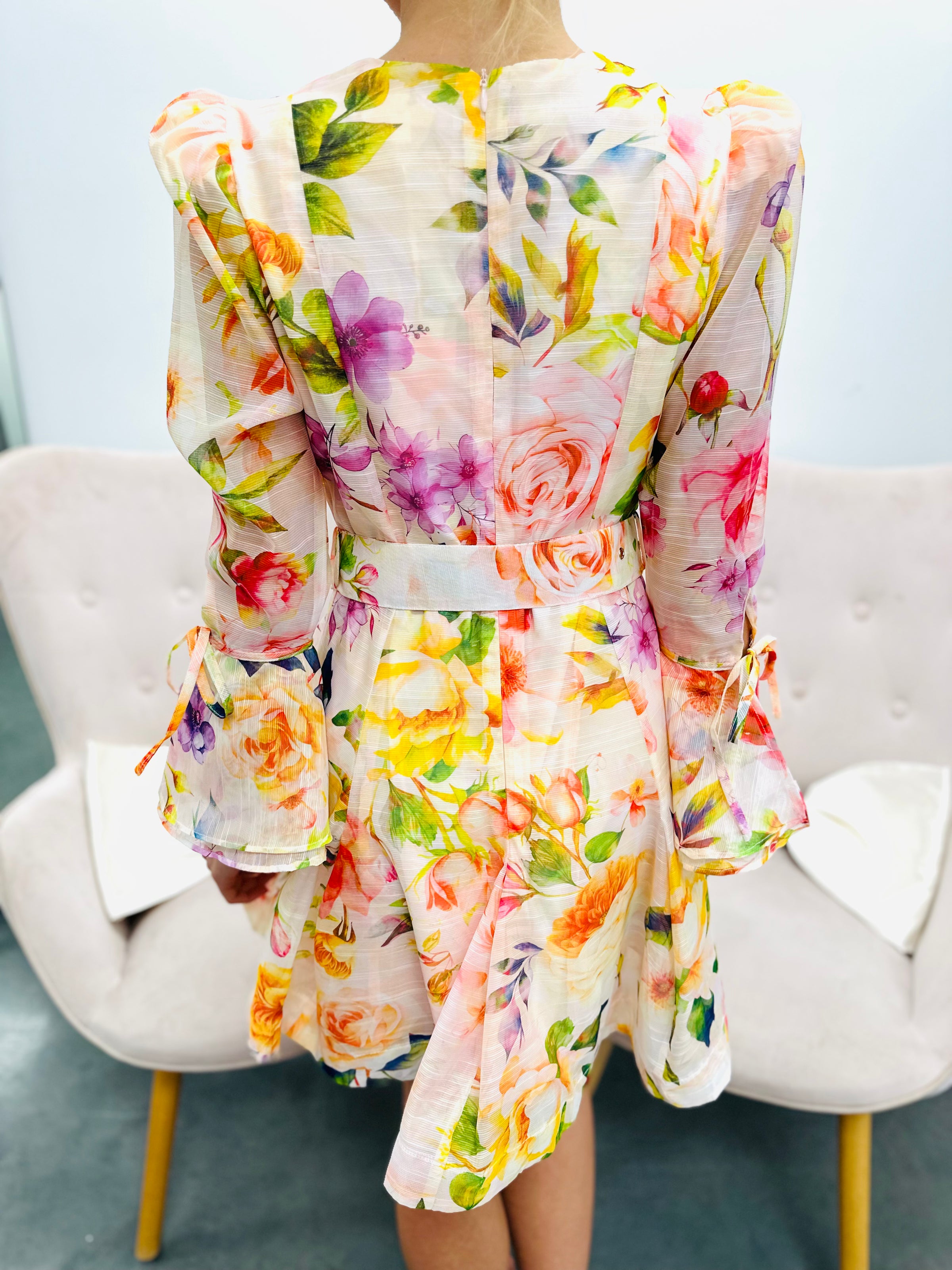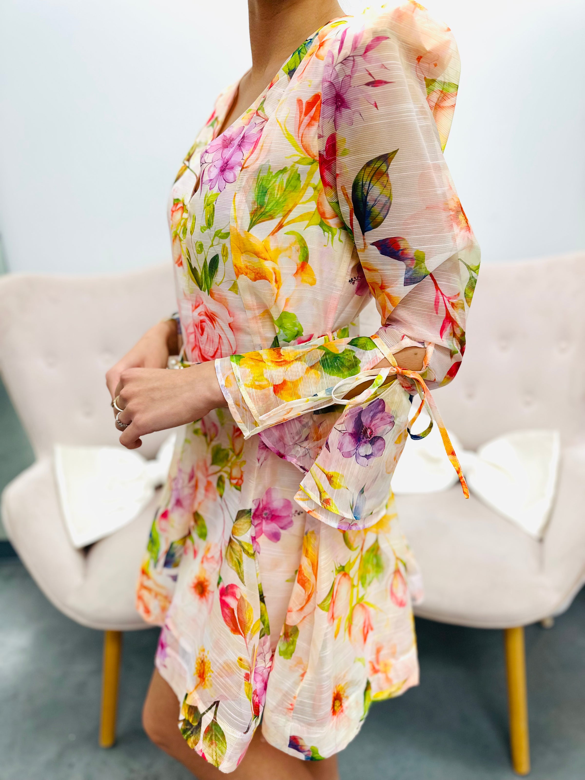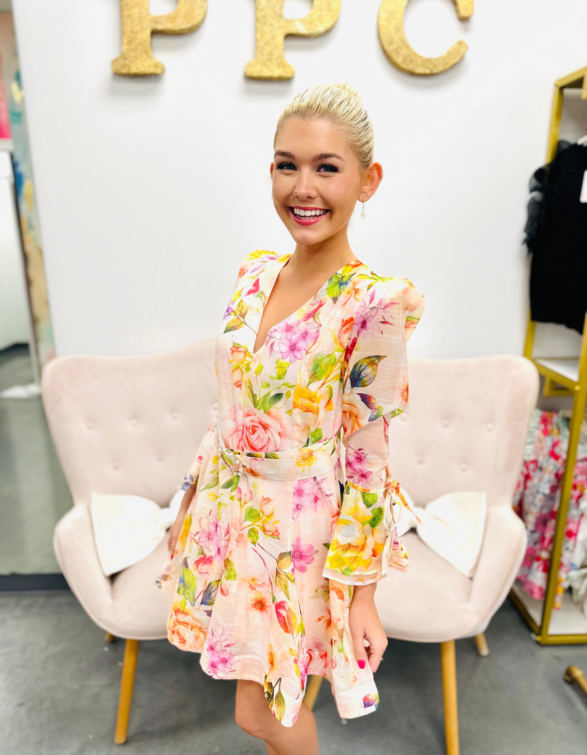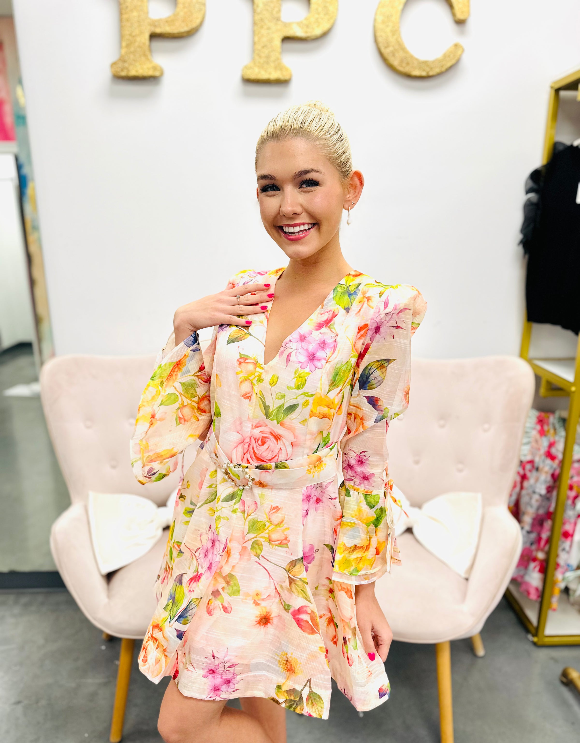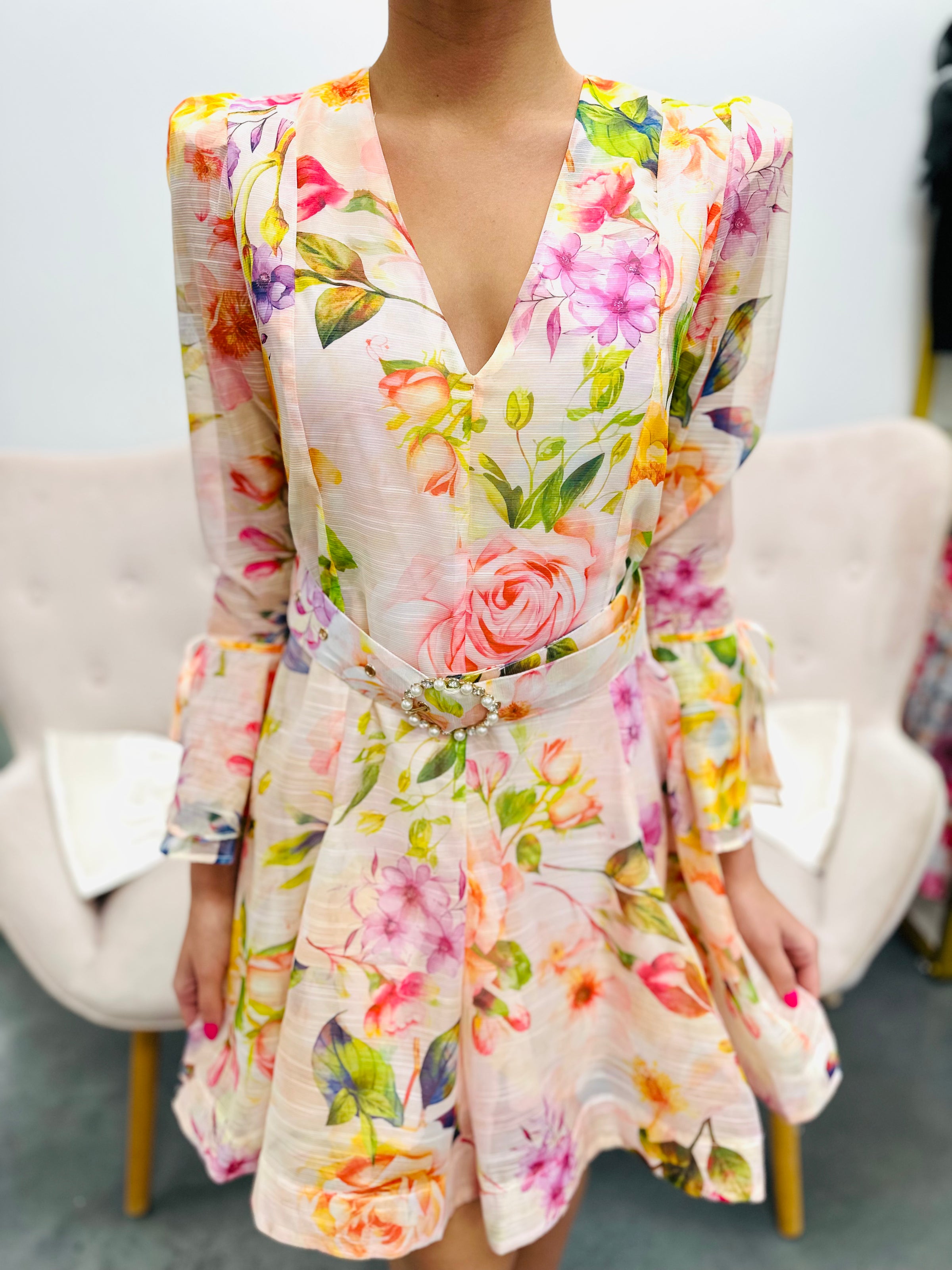 Get ready to turn heads in this gorgeous floral print dress! Made from a soft and smooth fabric, this V-neck dress features long sleeves and a cinched waist for a flattering and feminine silhouette. Complete with a belt adorned with rhinestones and pearls, this dress is both fun and flirty.