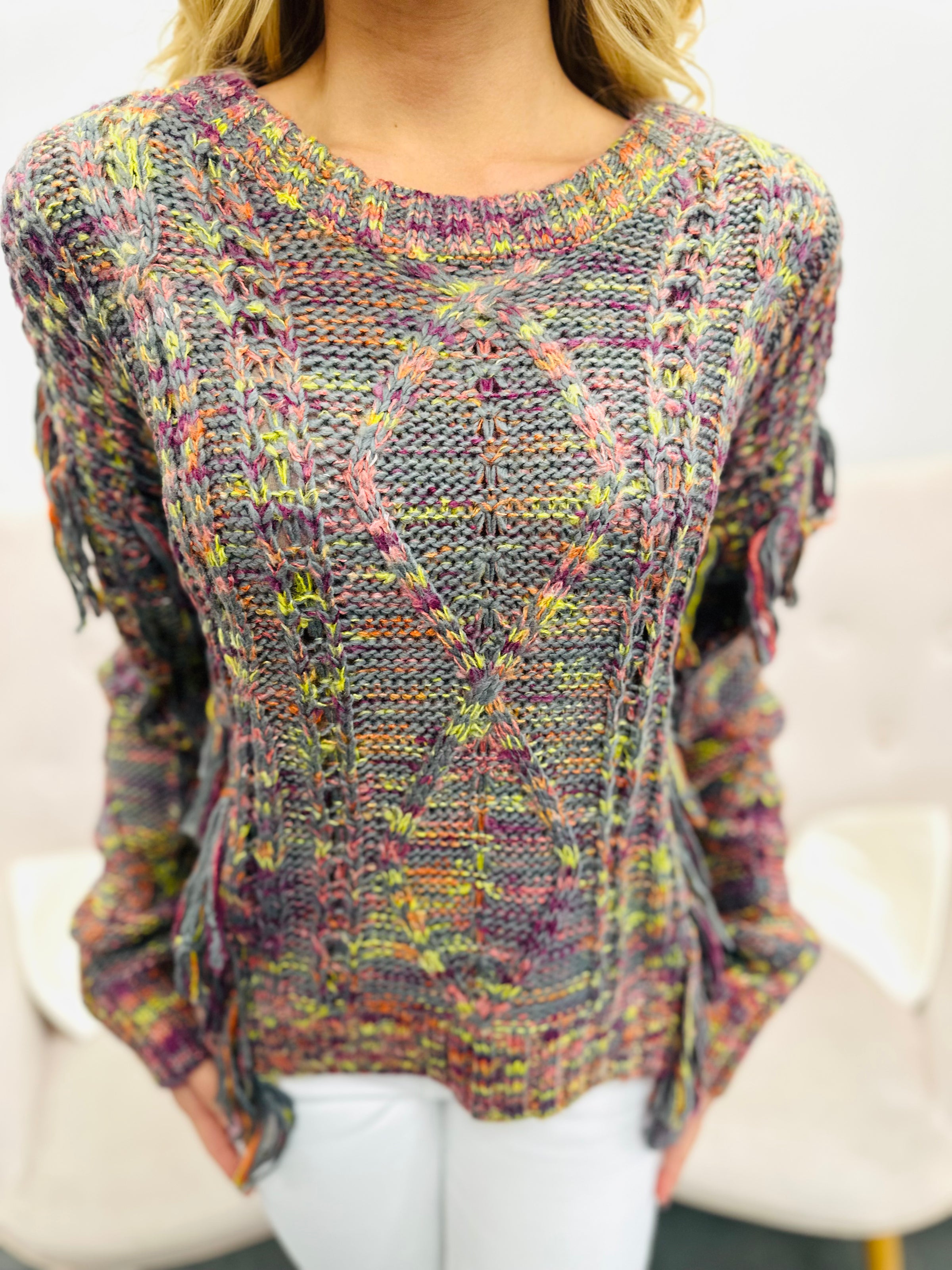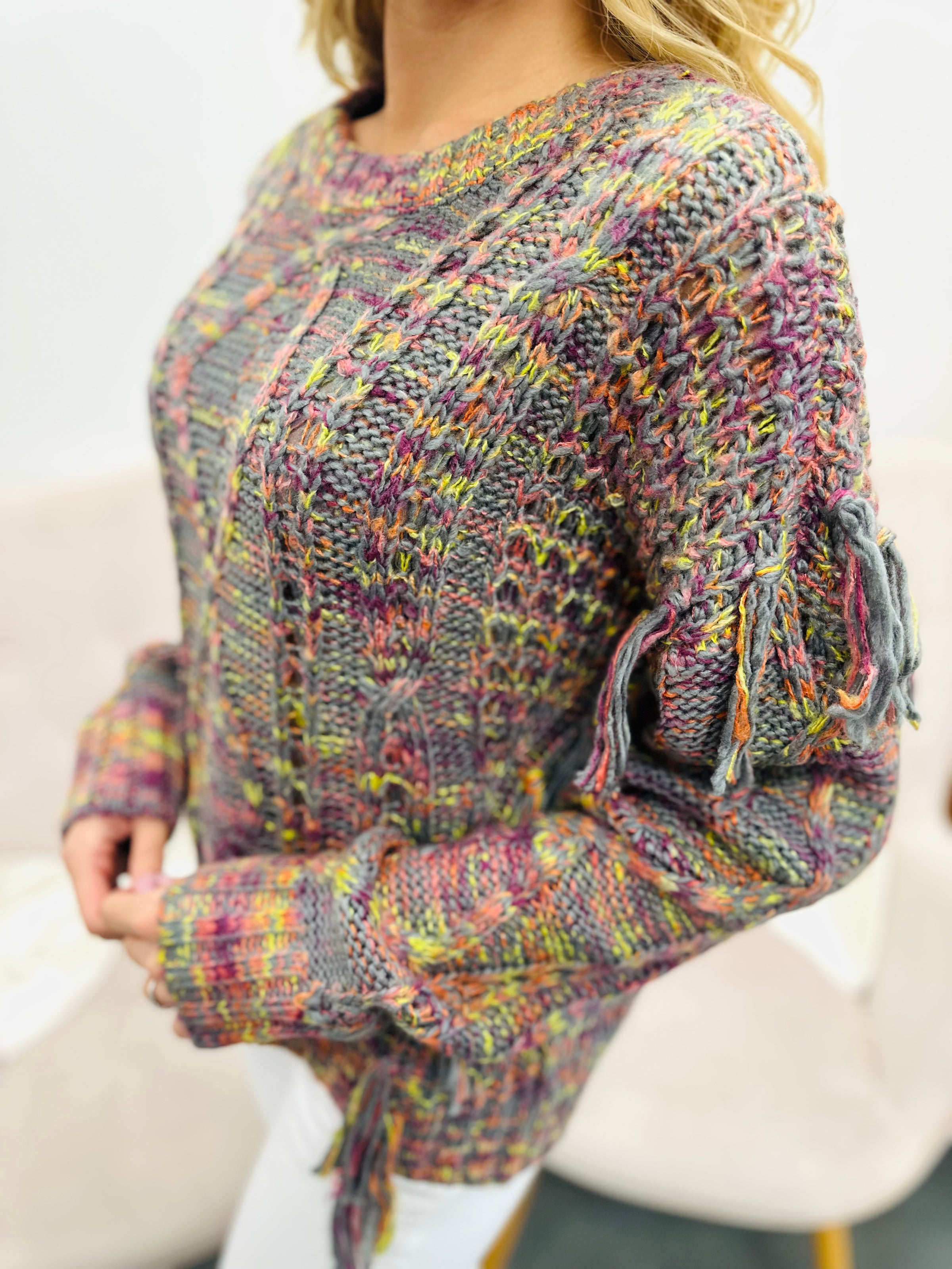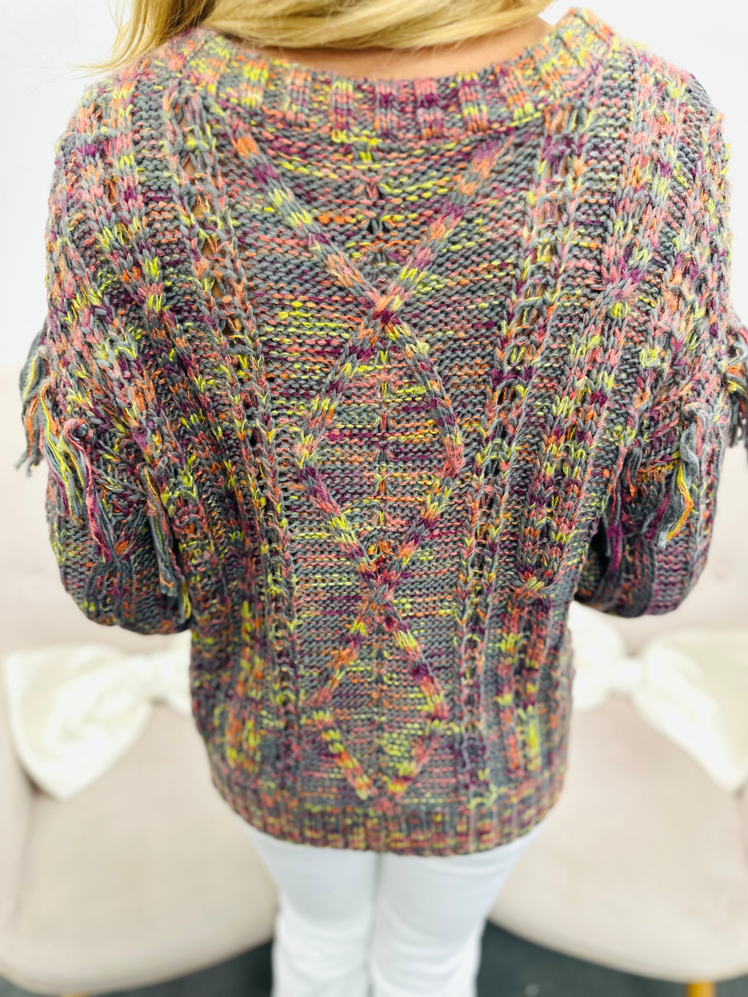 This western multi color fringe sweater is expertly crafted using high-quality materials and features a vibrant and eye-catching design. With its unique fringe detailing, this sweater adds a touch of western flair to any outfit. Stay warm and stylish this season with this must-have addition to your wardrobe.