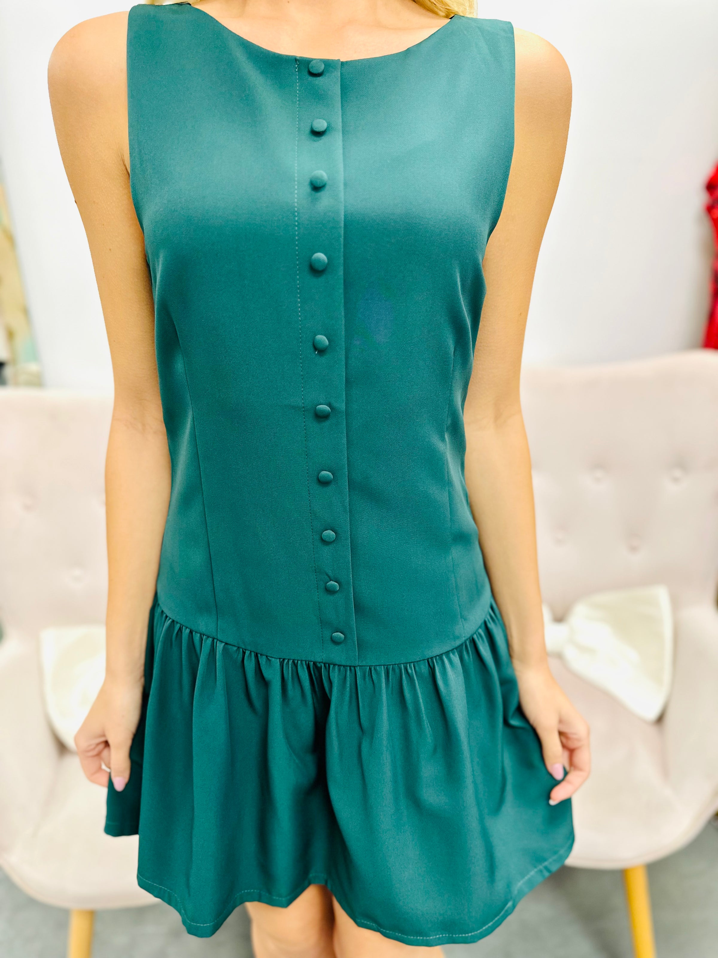 This elegant sleeveless dress features a timeless boat neck and a button-down front, blending classic style with modern ease. The delicate ruffle hem adds a subtle feminine touch, creating graceful movement with every step. Perfect for sophisticated occasions, its refined design offers both comfort and effortless elegance.