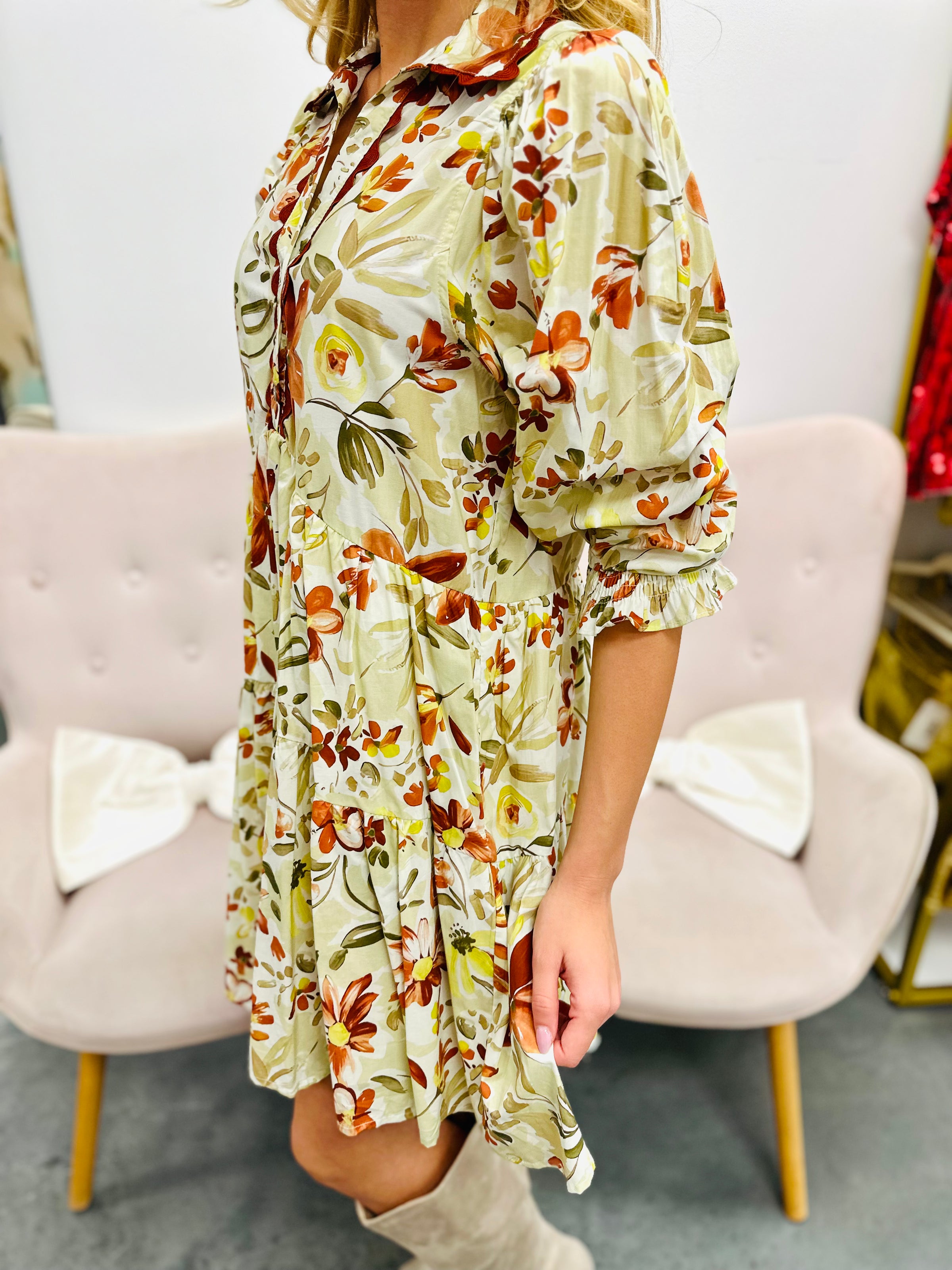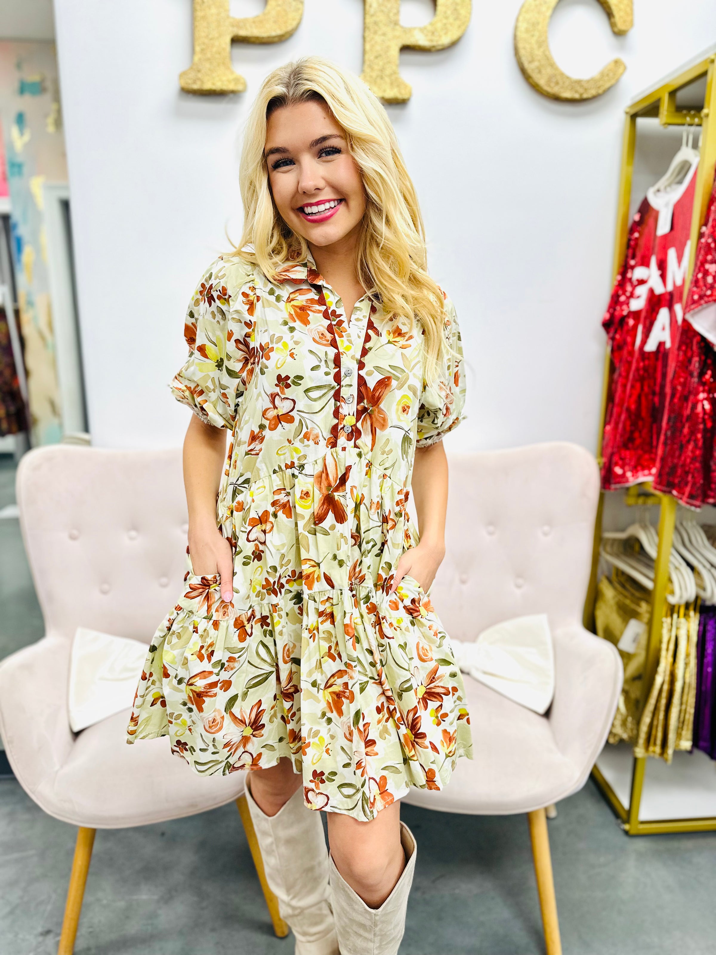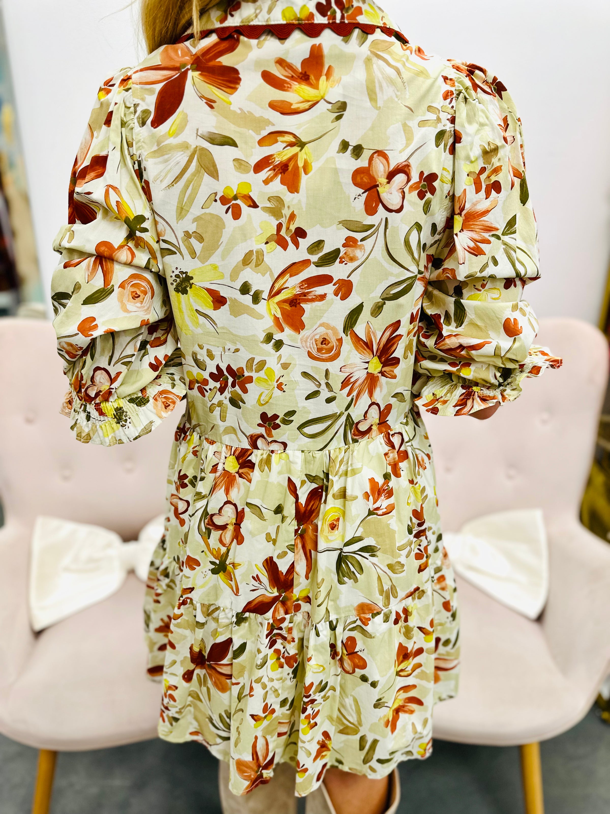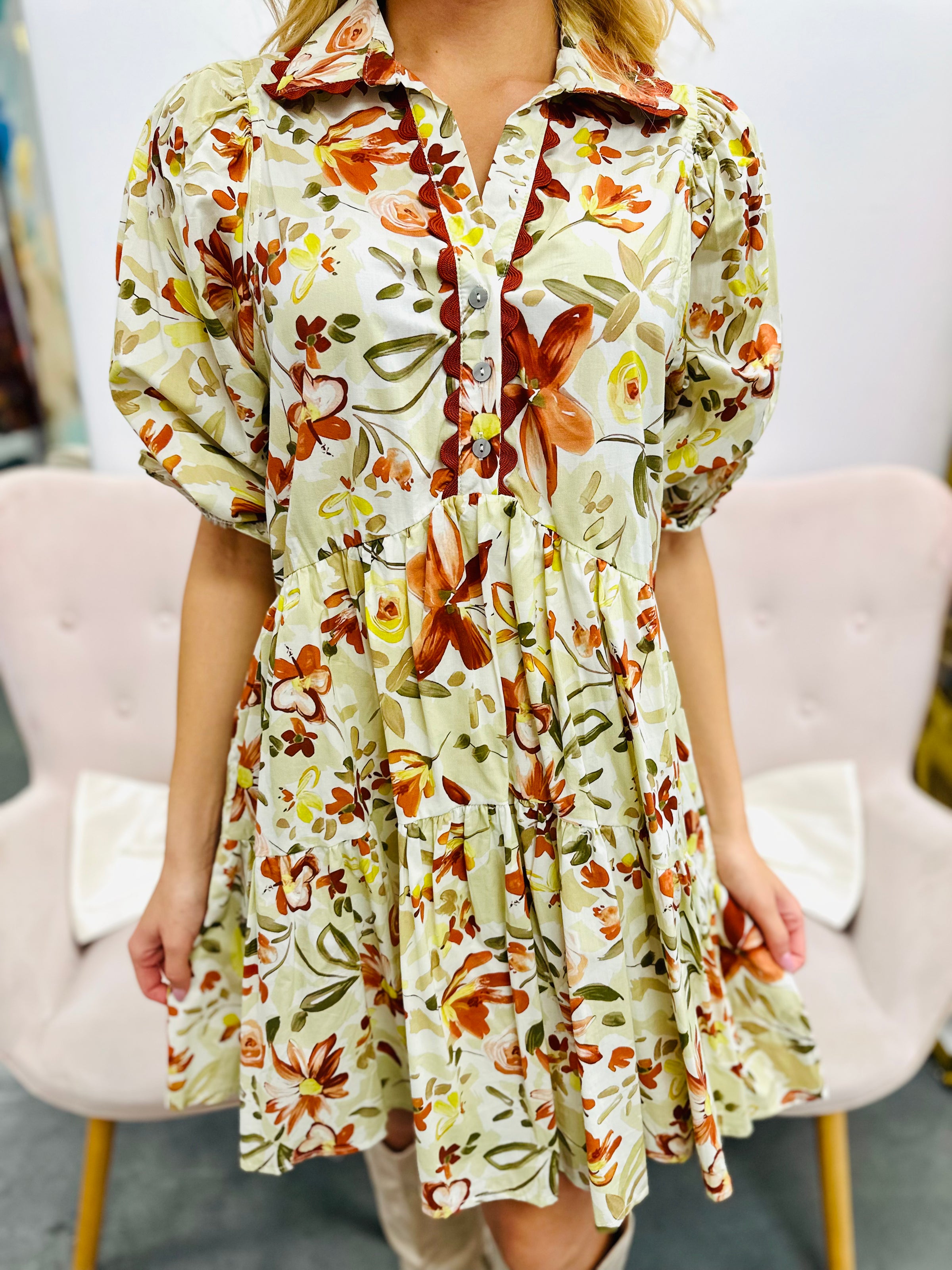 Introducing our beautiful floral printed poplin tiered mini dress! With a chic collar and half button closure, it is trimmed with medallion details for a unique touch. The smocked back panel provides a comfortable fit, while the lightweight, lined fabric makes it perfect for any occasion.