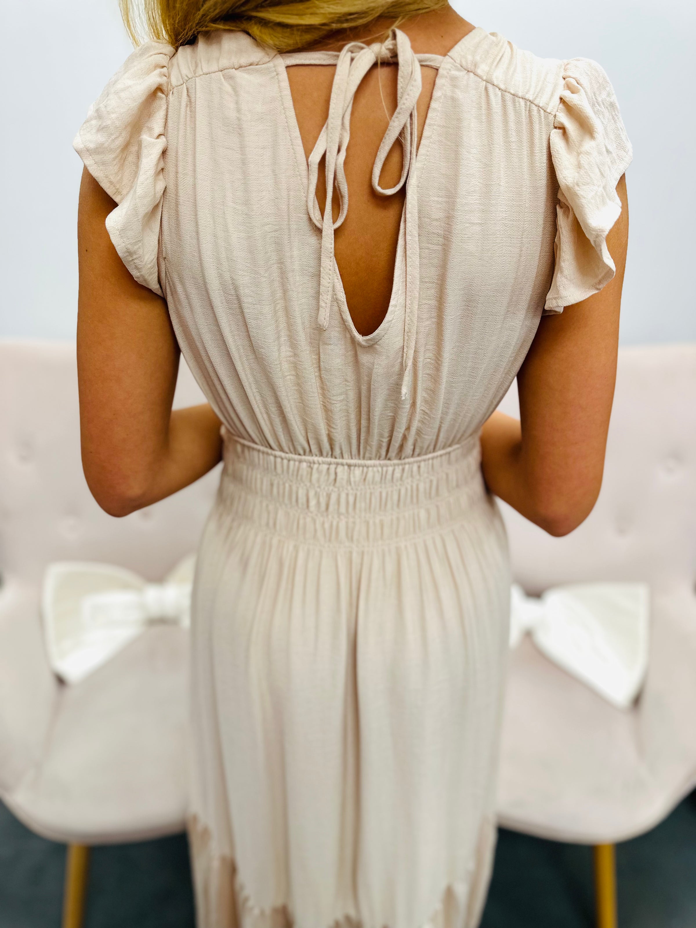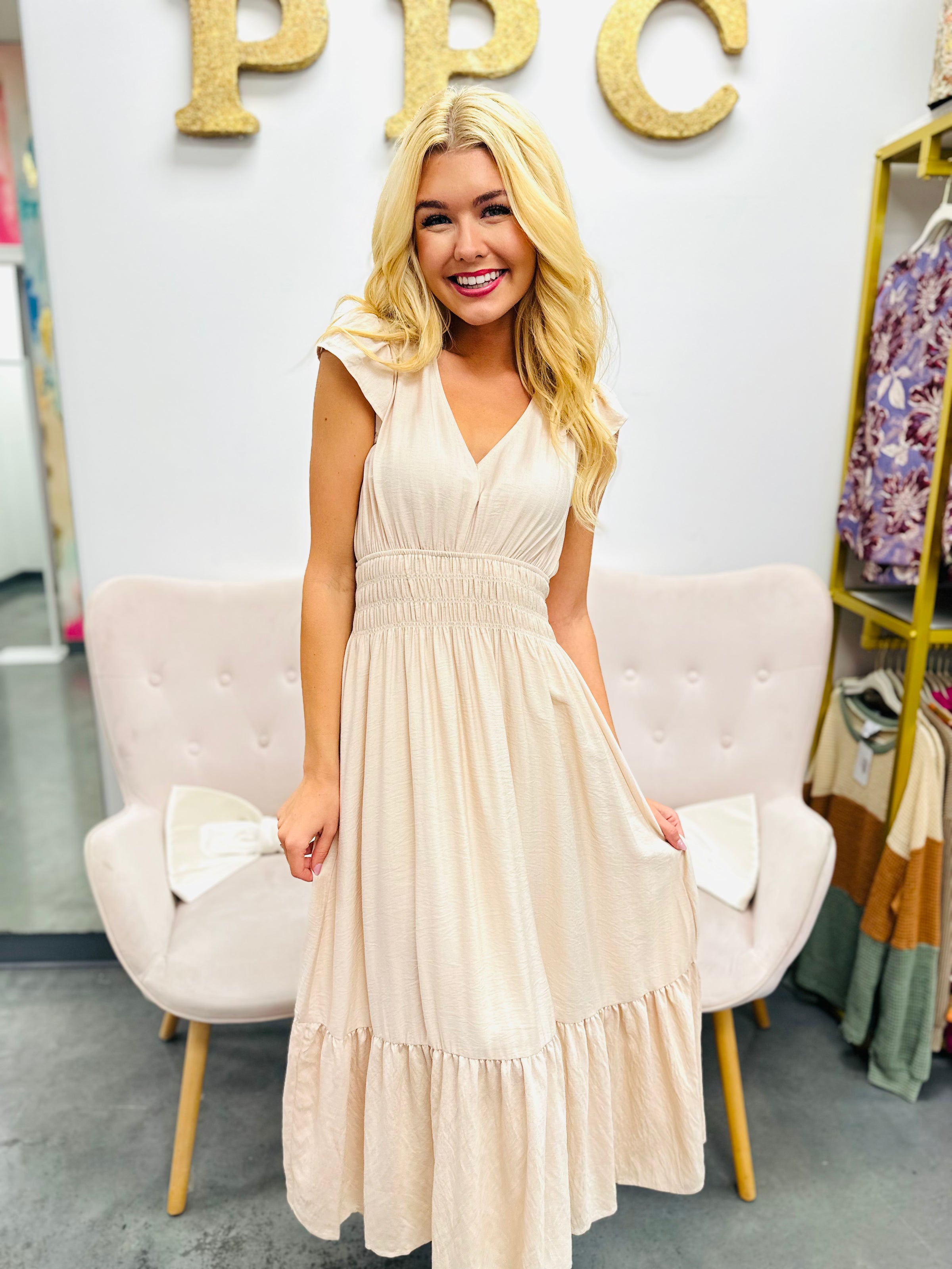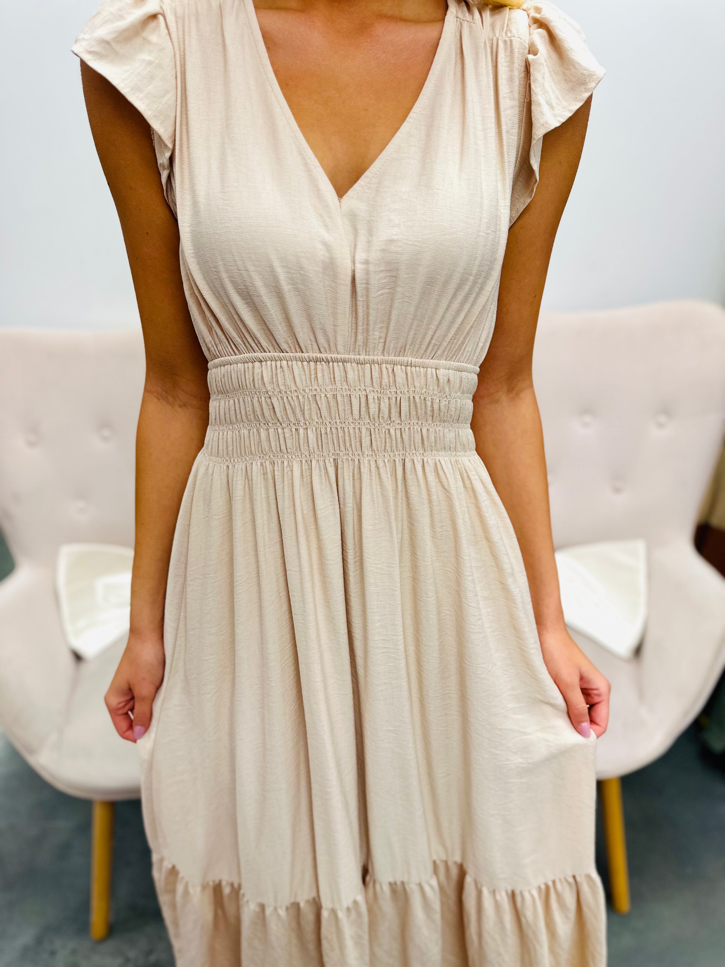 Step out in style with this playful midi dress featuring a flattering V-neck and charming ruffle details at the waist. Its elegant silhouette highlights your curves, while the ruffles add a fun, flirty touch perfect for day or night occasions. Comfortable and chic, this dress is ready to keep up with your lively lifestyle.