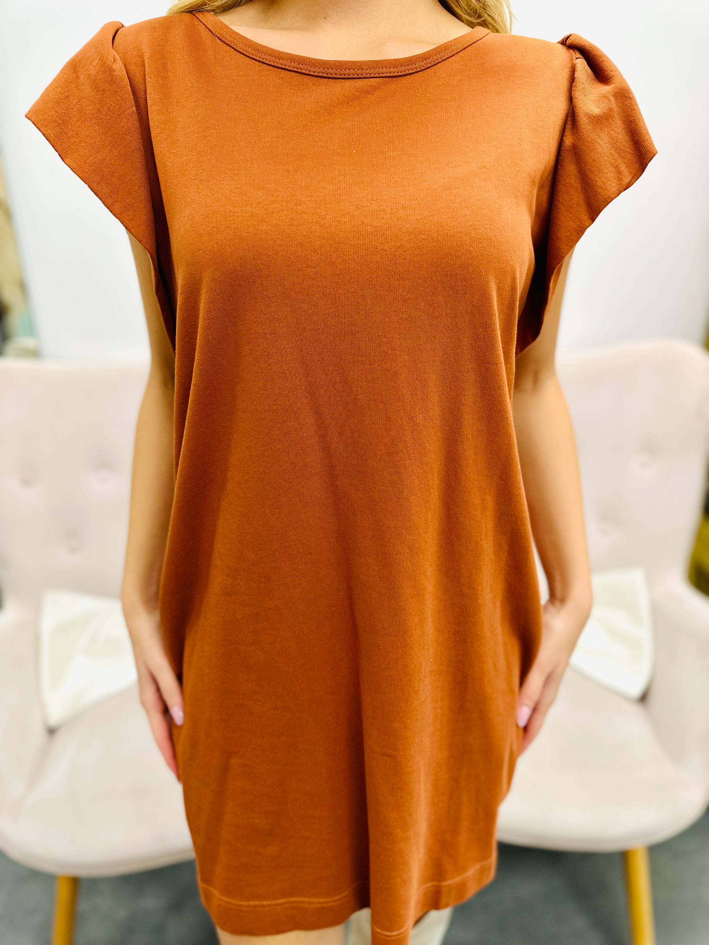 This comfortable, loose fitting dress is perfect for weekend errands. Made of cotton, this dress has stylish ruffle sleeves and convenient side pockets. Perfect for running around in style!