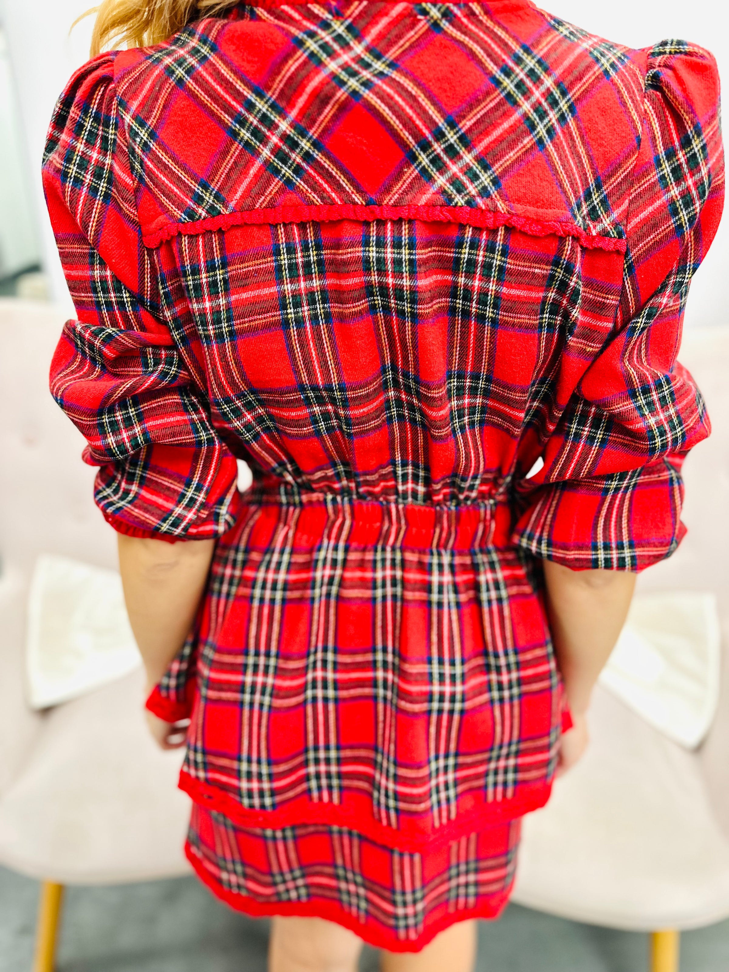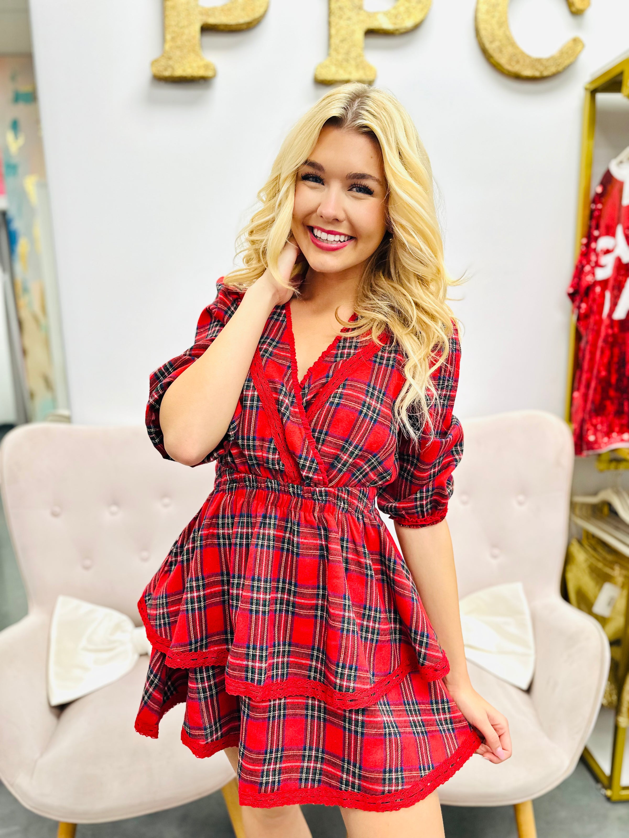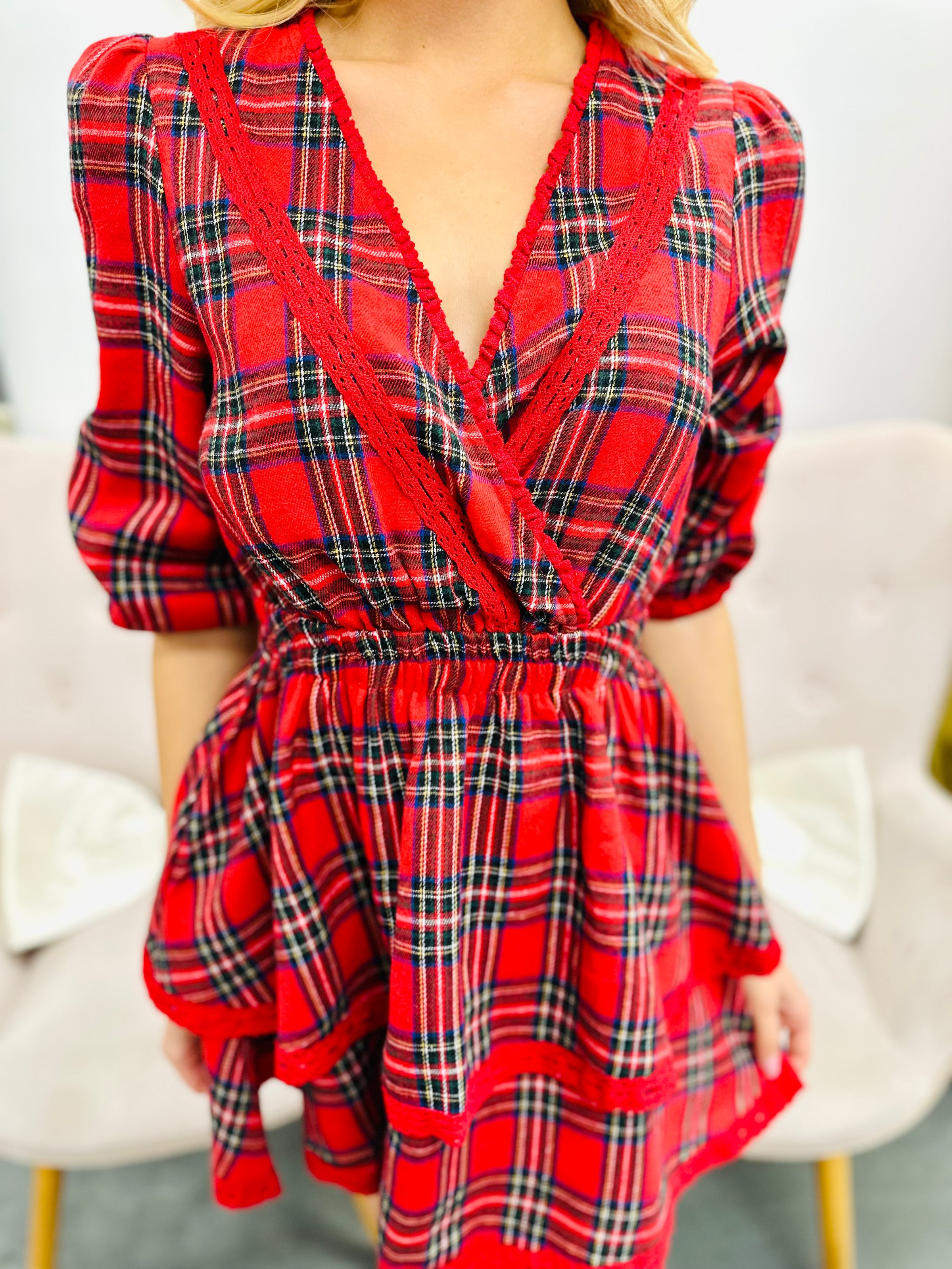 Dress up for the holidays in this plaid tiered style with lace trim. The layered design and festive tartan pattern make it a go-to choice for seasonal celebrations and special moments.