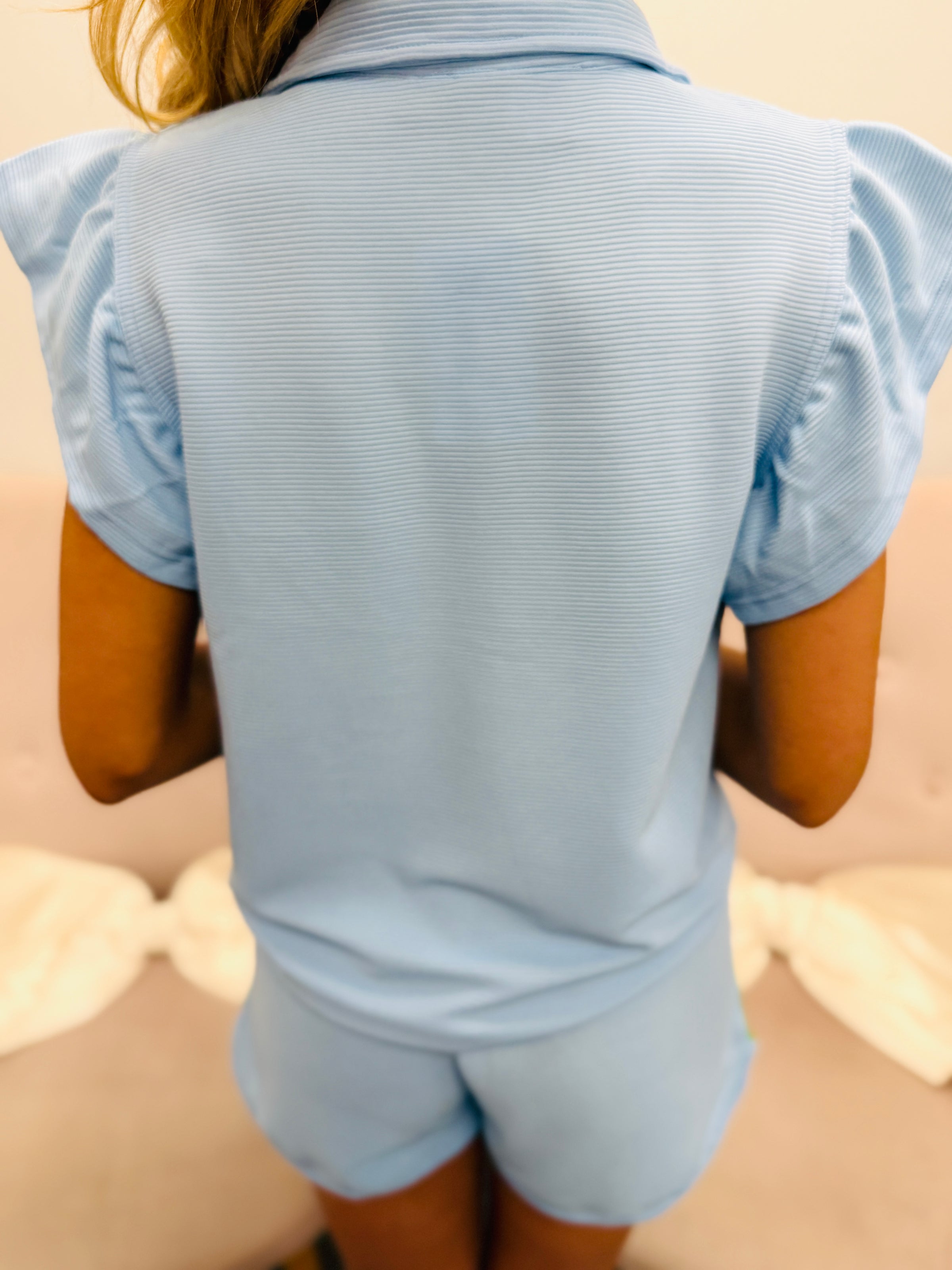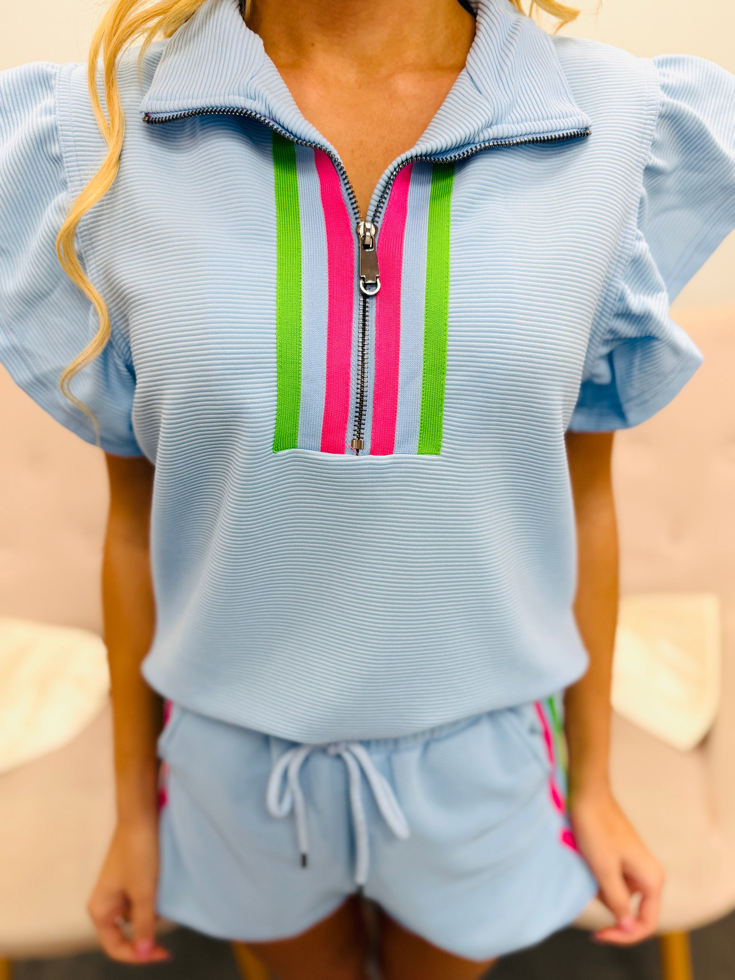 Sporty, playful, and ready for sunny days. This easy two-piece set features a textured fabric with a relaxed silhouette that keeps things comfortable while still looking polished. The zip neckline and bold contrast stripe detail add a fun pop of color, while the ruffle sleeves bring a feminine touch.