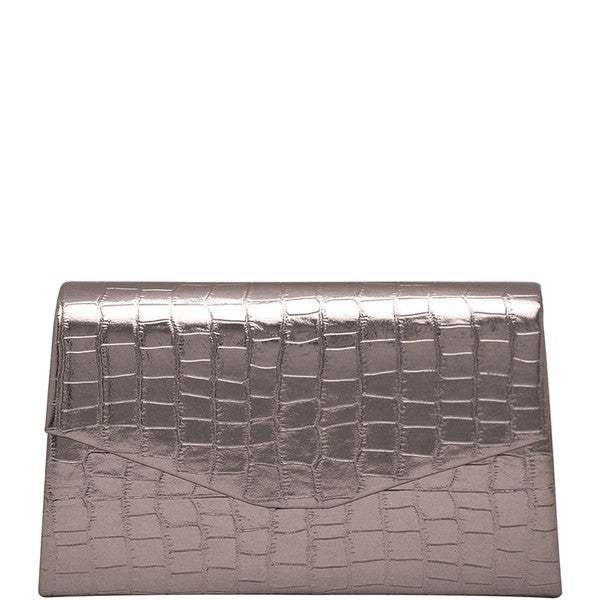 This elegant metallic flap clutch features a chic croc-embossed texture, adding a refined edge to your ensemble. Its detachable strap offers versatile styling options—carry it as a sleek clutch or wear it crossbody for hands-free convenience. Perfectly sized for essentials, it effortlessly complements both day and evening looks with understated sophistication.