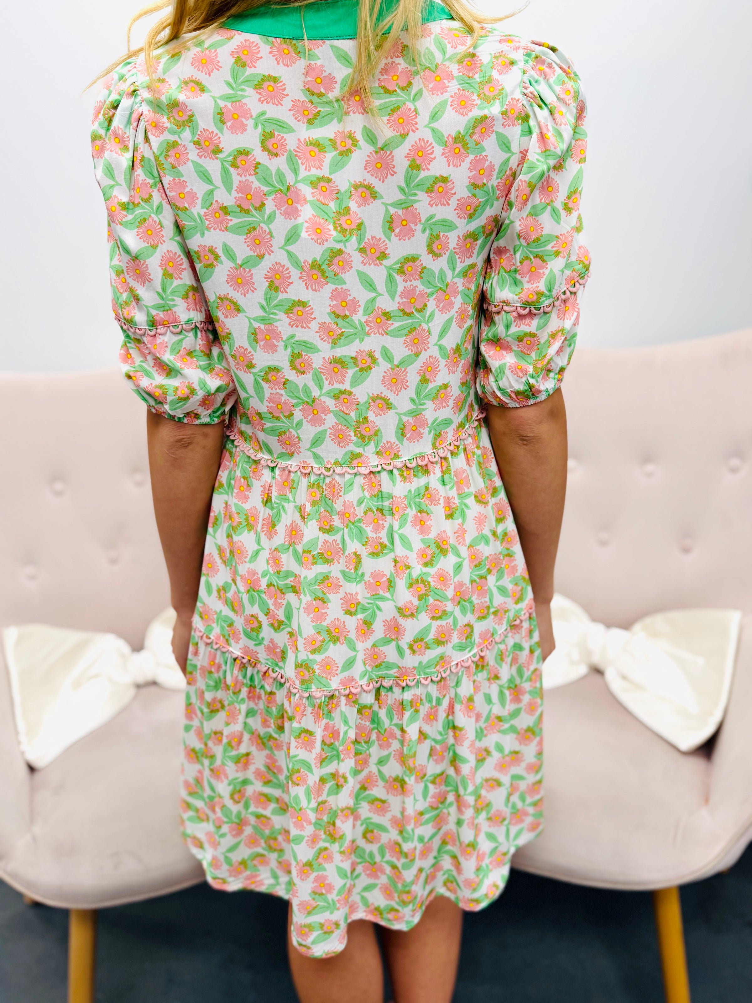 Fresh, feminine, and full of charm. The delicate floral print paired with vibrant contrast trim creates a look that feels playful yet polished. The flattering split neckline and soft puff sleeves add just the right amount of structure while keeping the overall feel light and effortless.