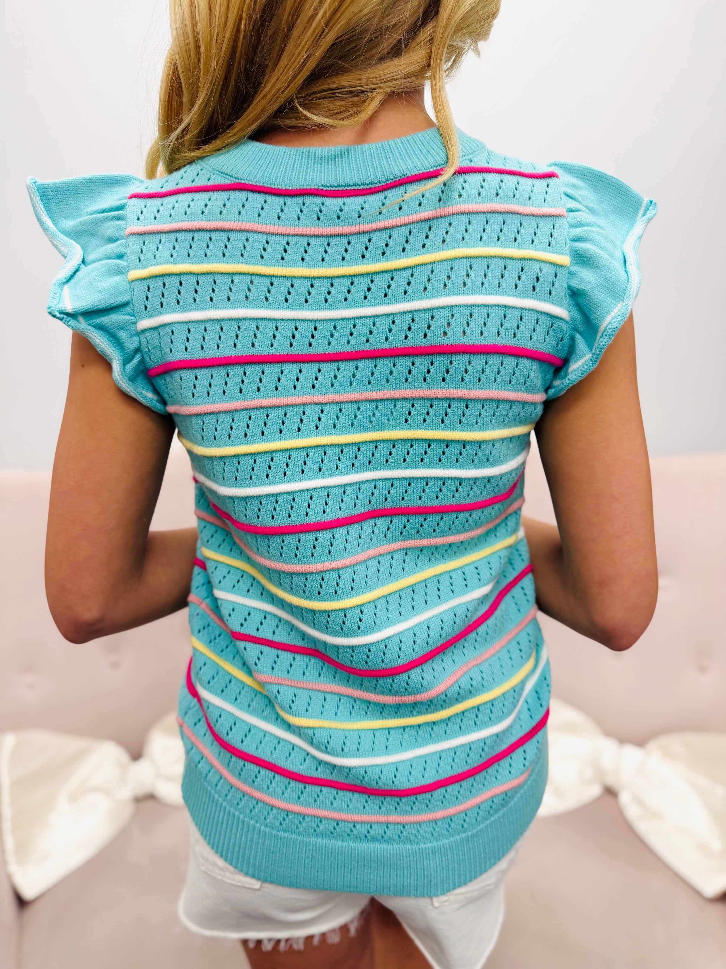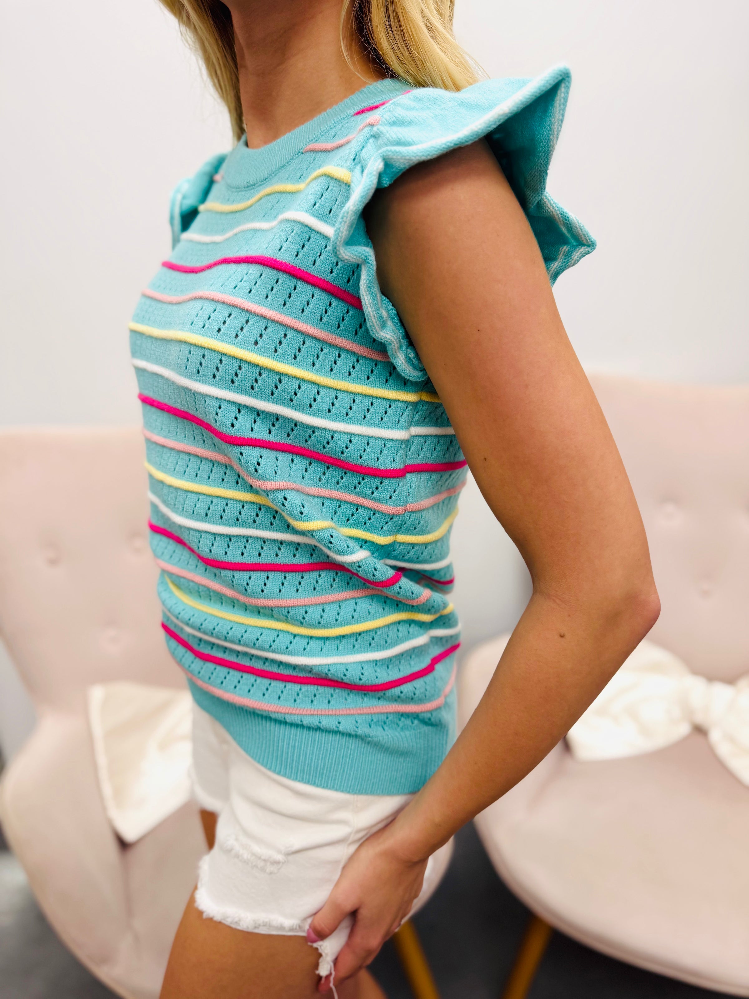 The lightweight knit and flutter sleeves create an easy, flattering fit that pairs effortlessly with denim, shorts, or white bottoms for a fresh look that’s perfect for warm days and casual outings.