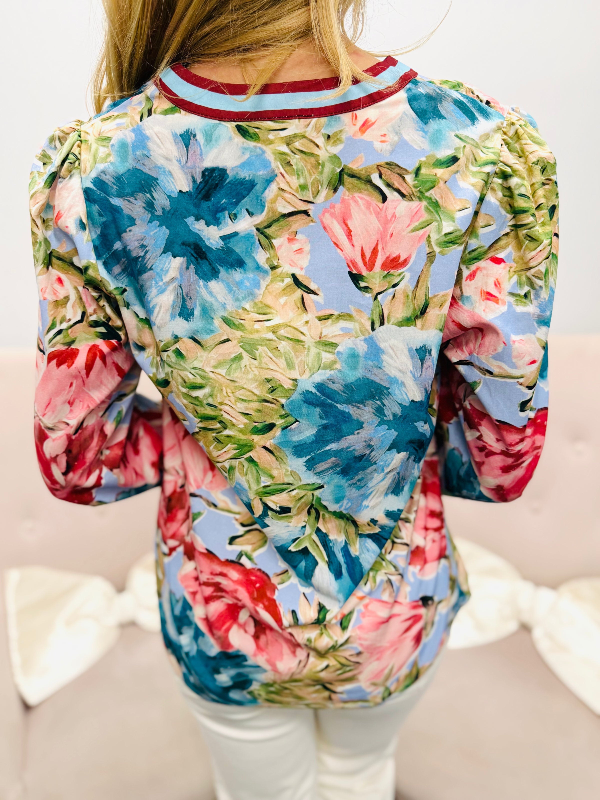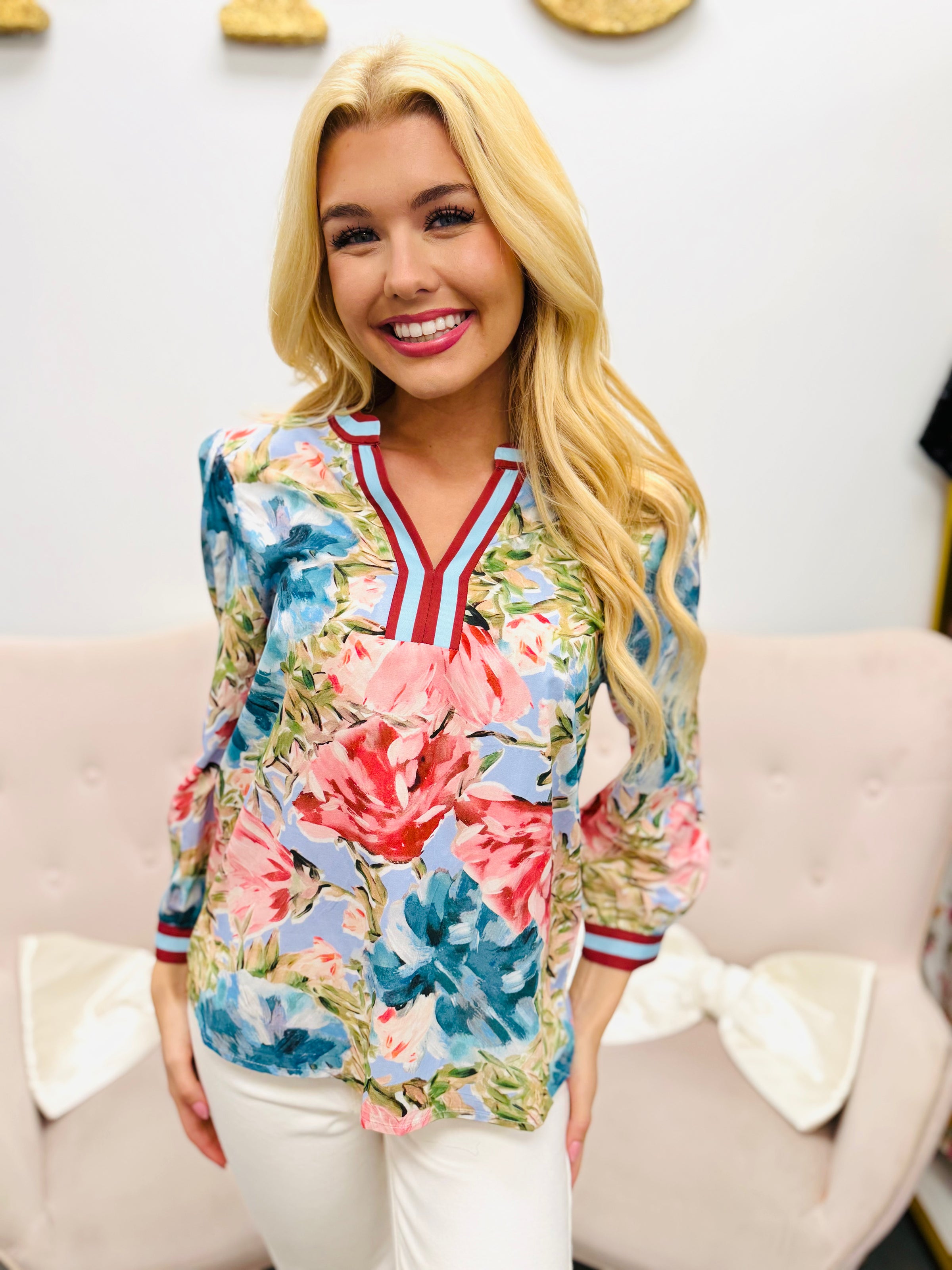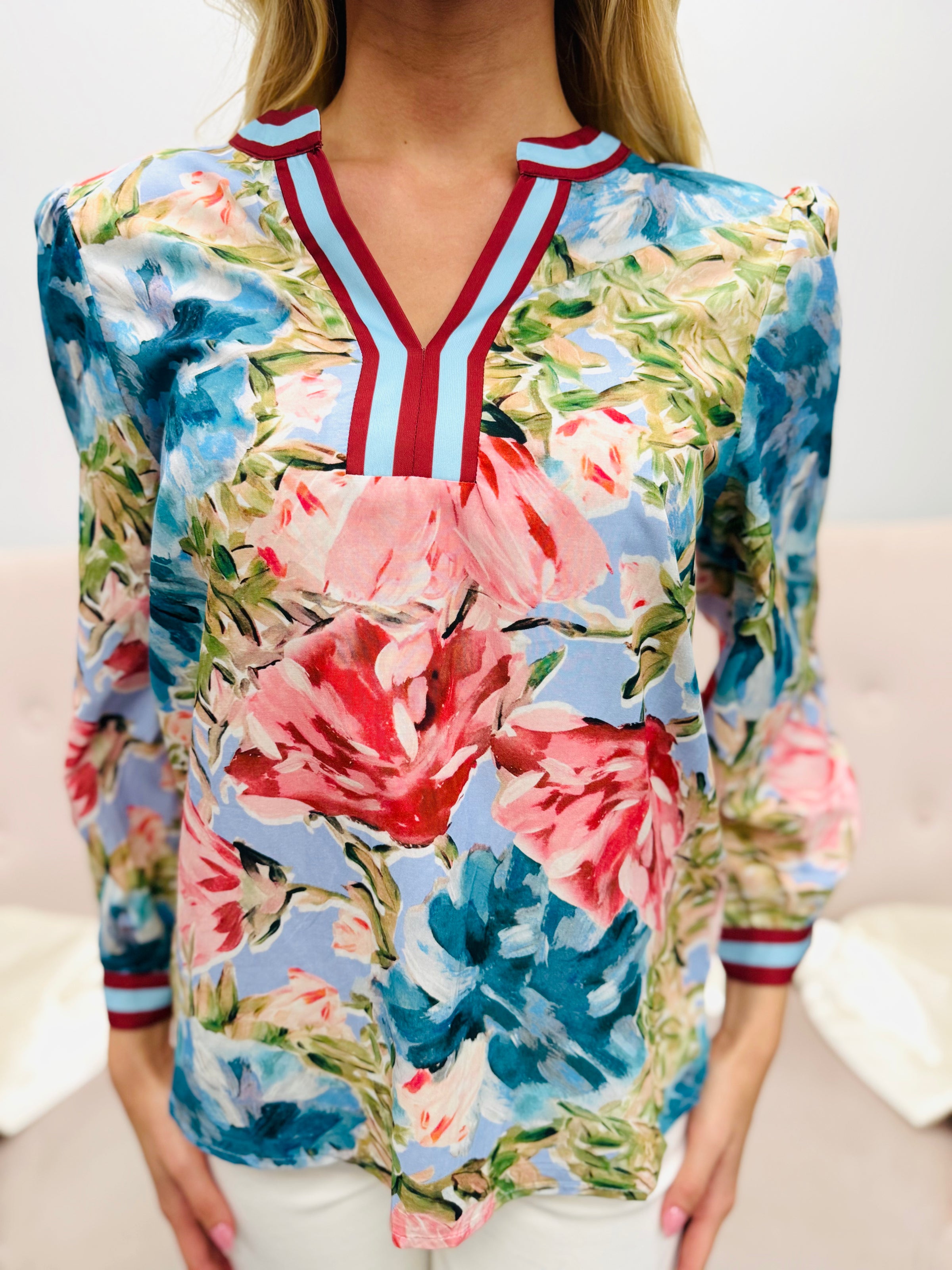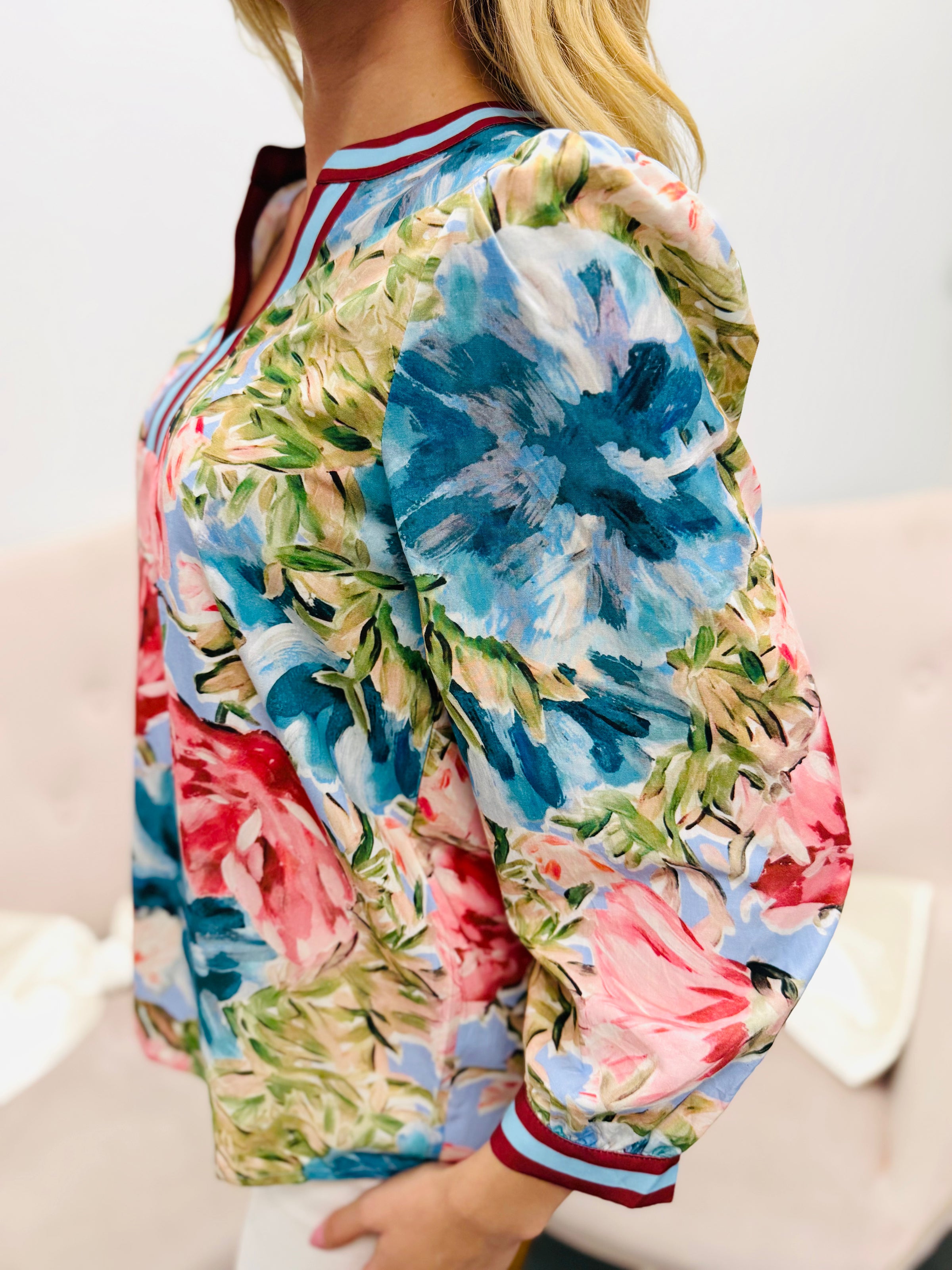 Bold, colorful, and effortlessly eye-catching. The vibrant painterly floral print gives this piece a fresh, artistic feel while the contrast trim at the neckline and cuffs adds a polished finishing touch. Soft gathering at the shoulders creates a flattering shape that feels feminine without sacrificing comfort.