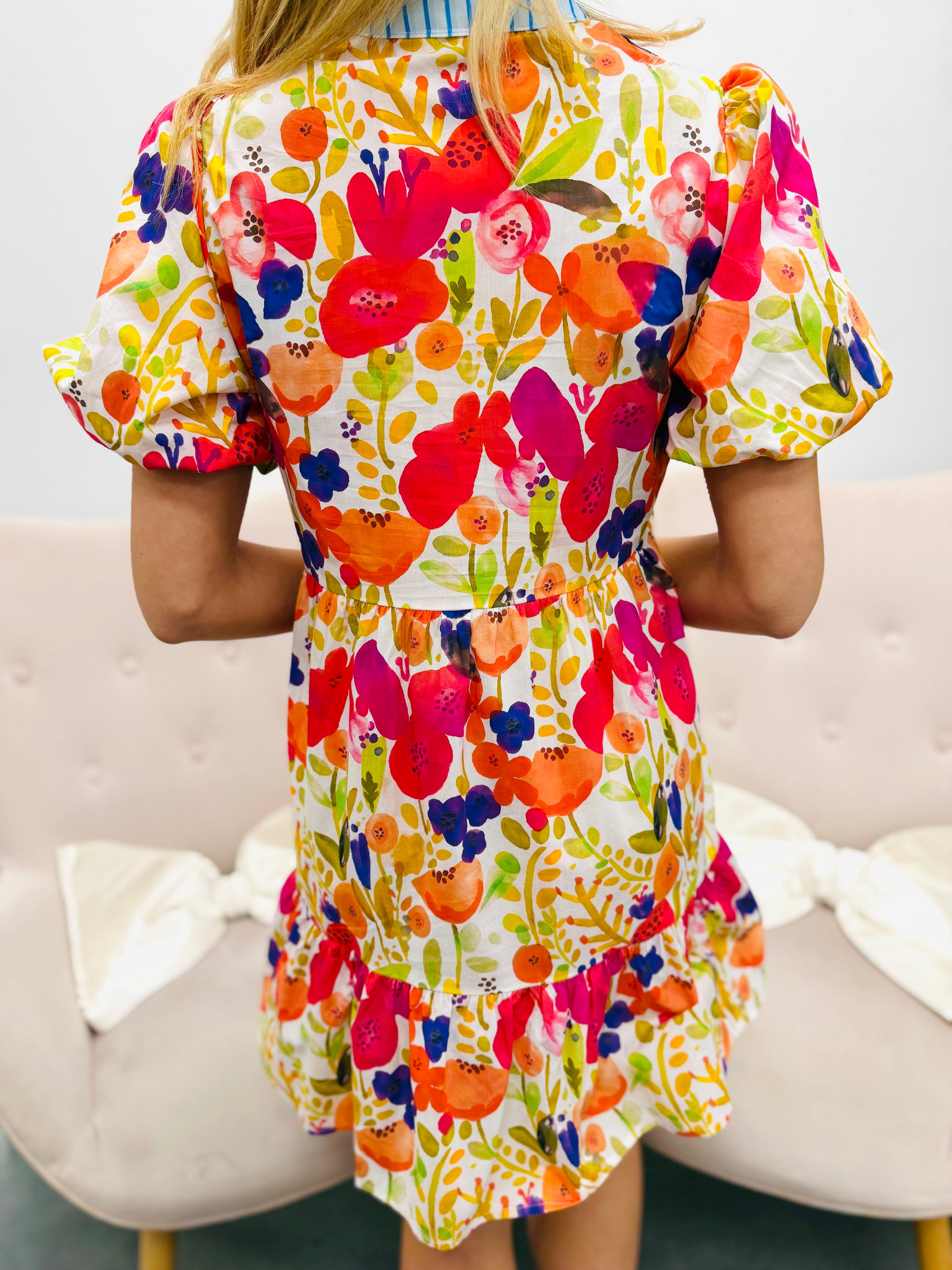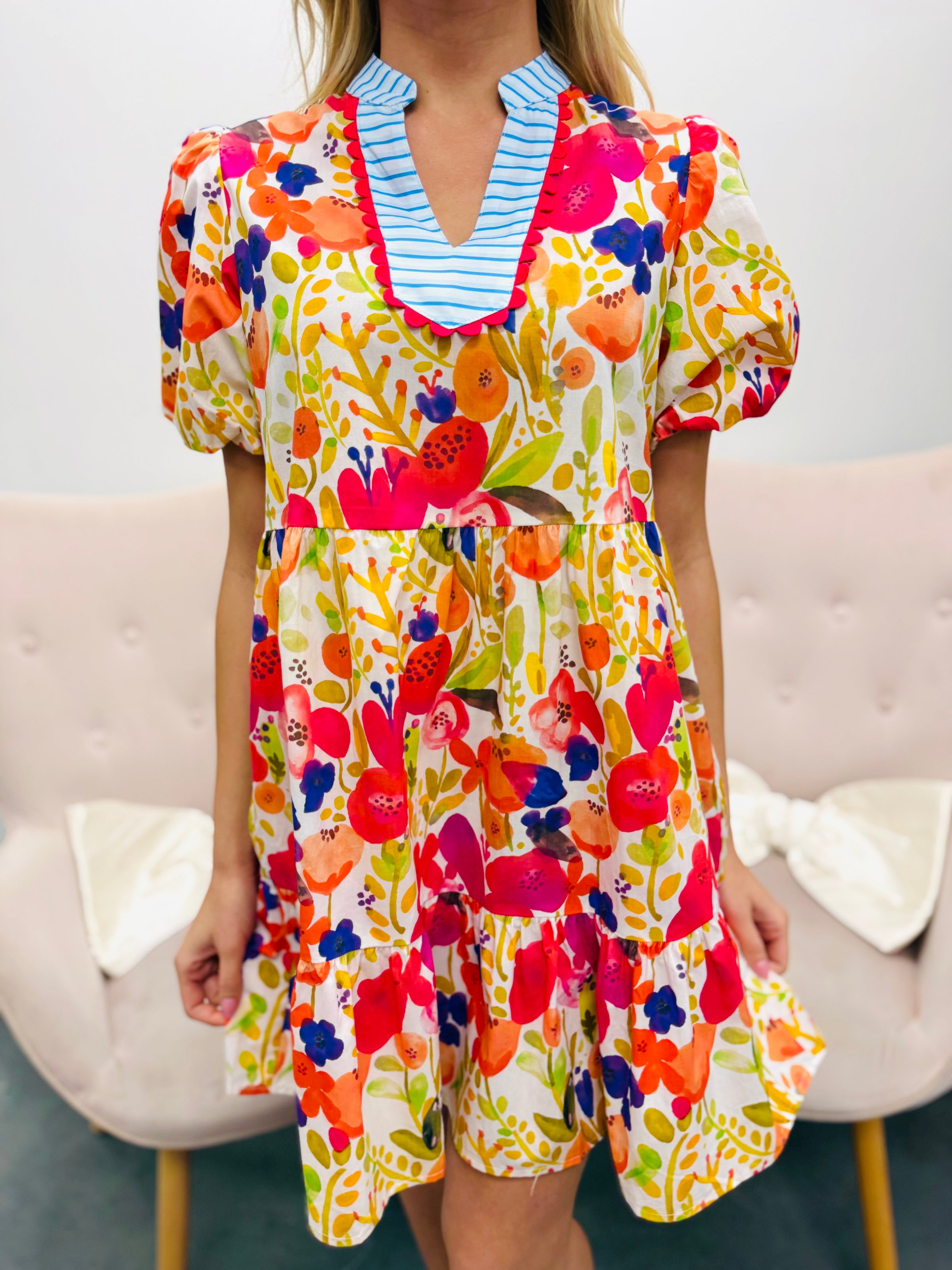 Bright, cheerful, and full of personality. The vibrant watercolor-style floral print brings a playful burst of color, while the contrast neckline with scalloped trim adds a unique, eye-catching detail. Soft puff sleeves and a tiered skirt create an easy silhouette that feels both feminine and comfortable.