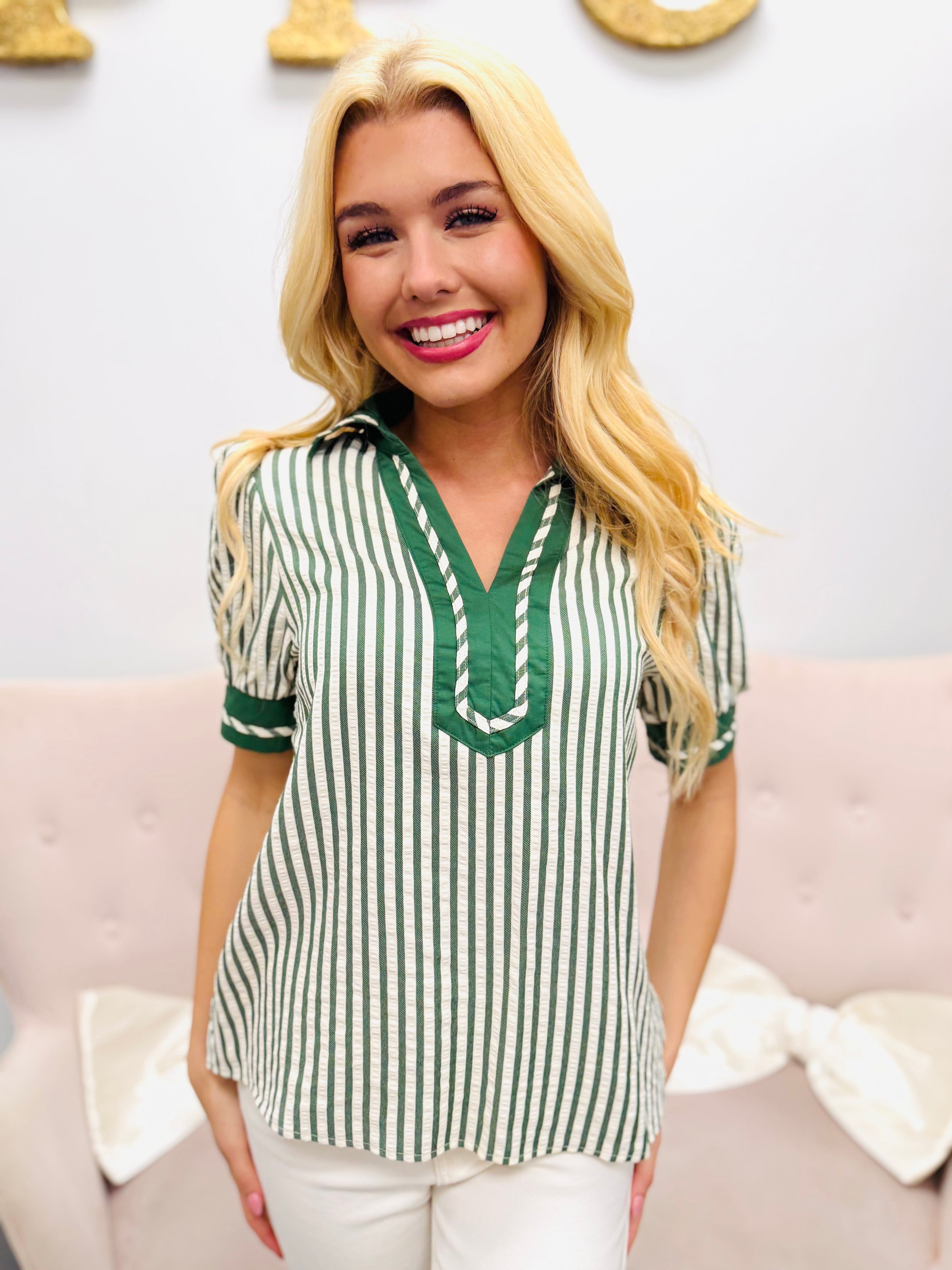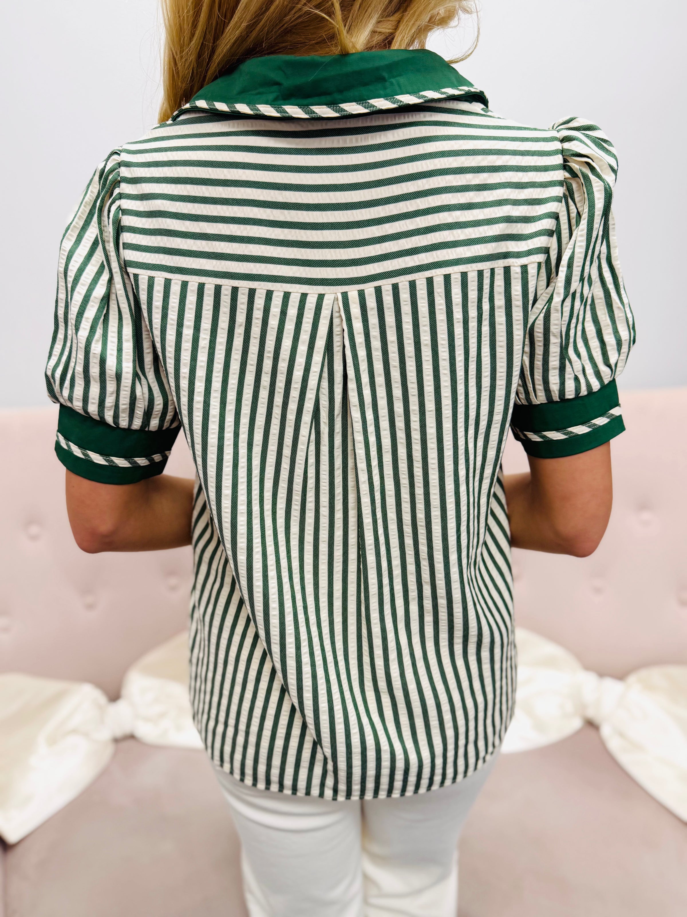 Effortlessly polished with a relaxed, everyday feel. The timeless stripe pattern keeps the look classic while contrast trim along the neckline and sleeves adds a subtle pop of detail. Soft gathering at the shoulders creates a flattering shape that feels feminine without being overdone.
