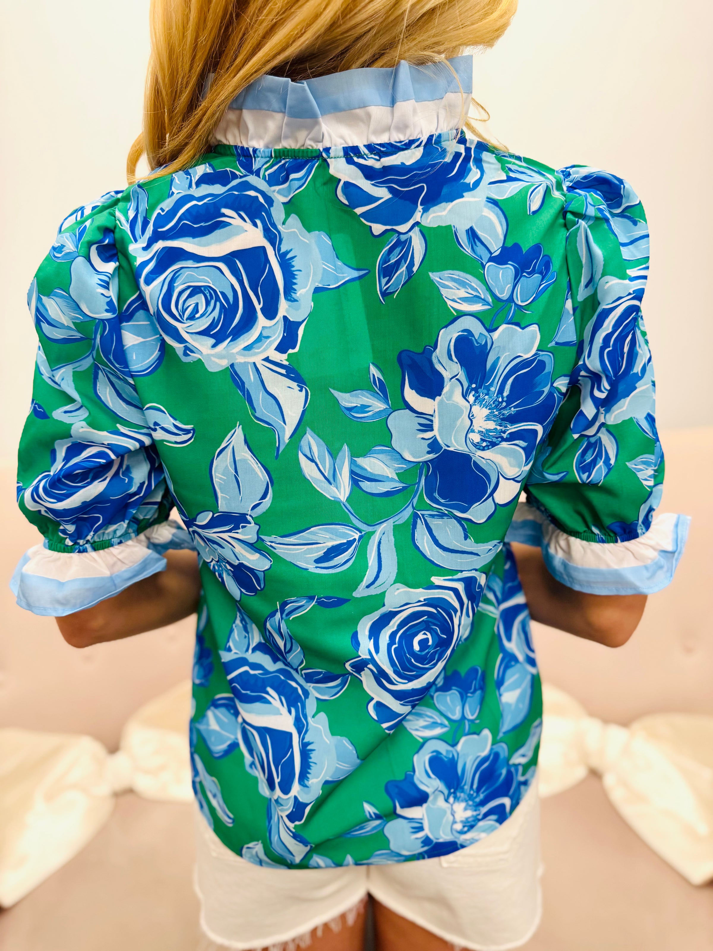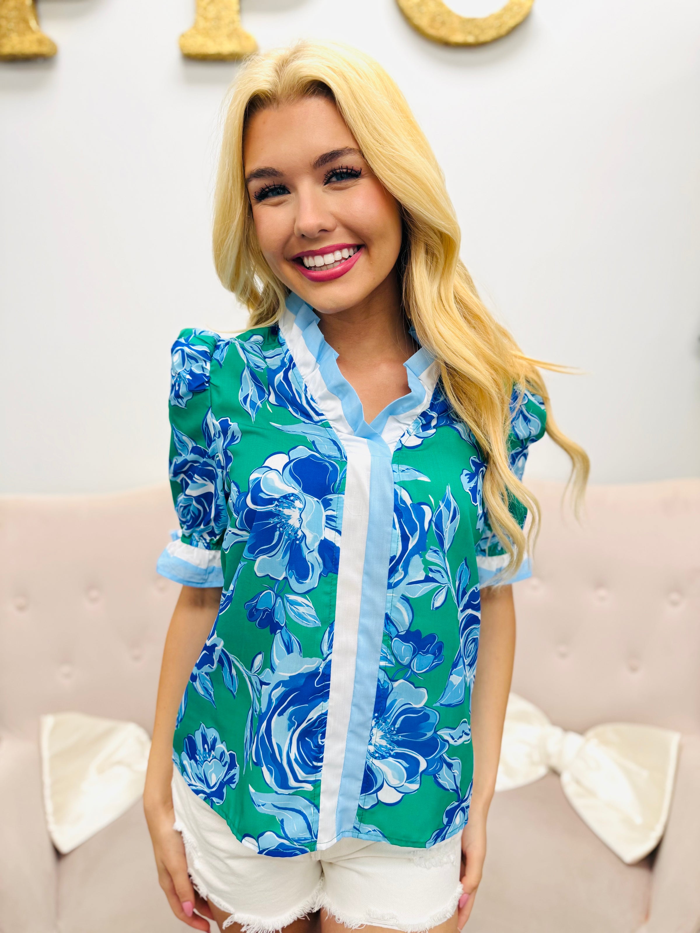 Bright, bold, and made to stand out. This playful piece features an eye-catching floral print paired with soft ruffle details along the neckline and sleeves for a touch of feminine charm. The relaxed fit keeps it comfortable while the contrast trim adds just enough structure to elevate the look.