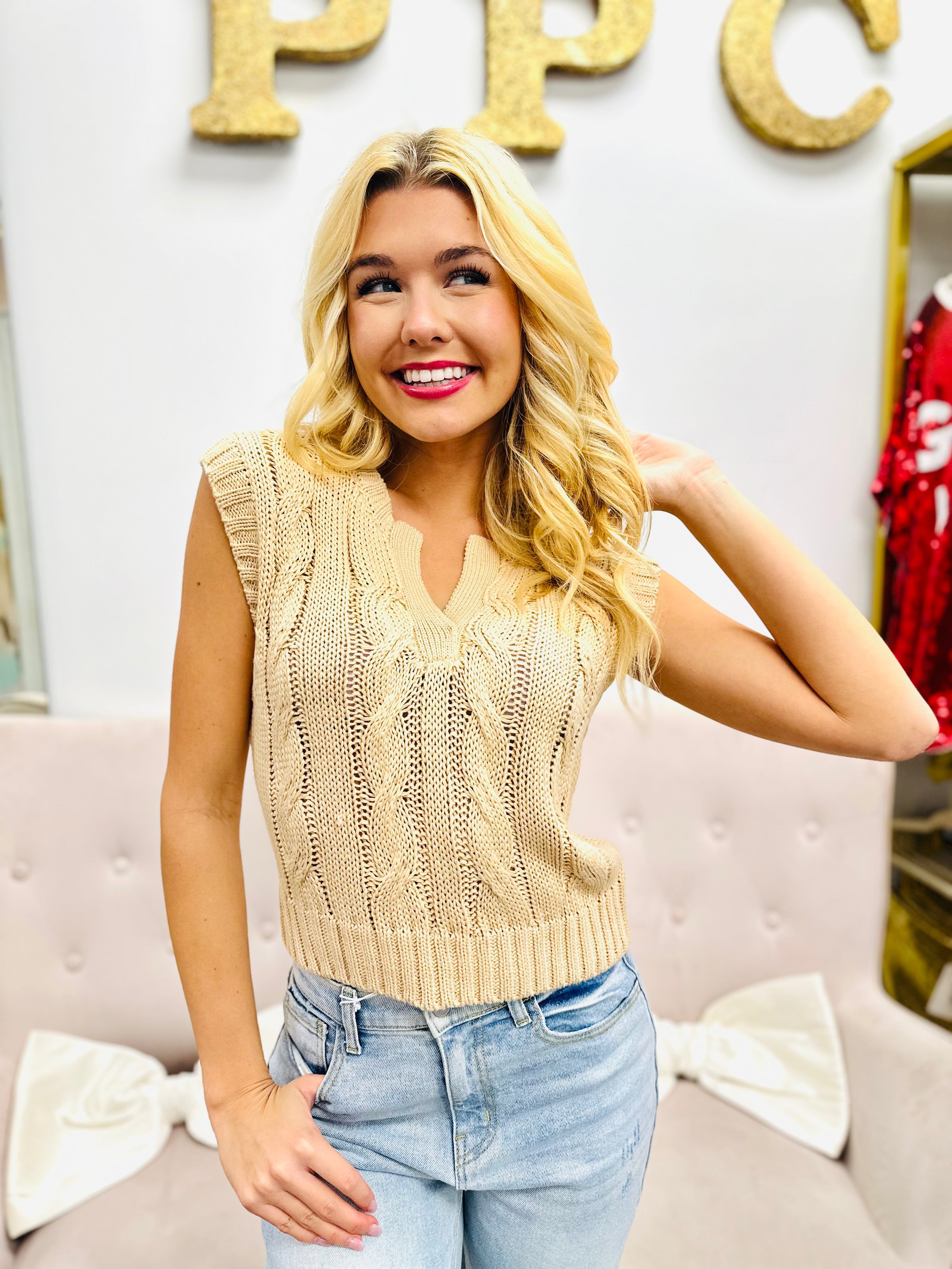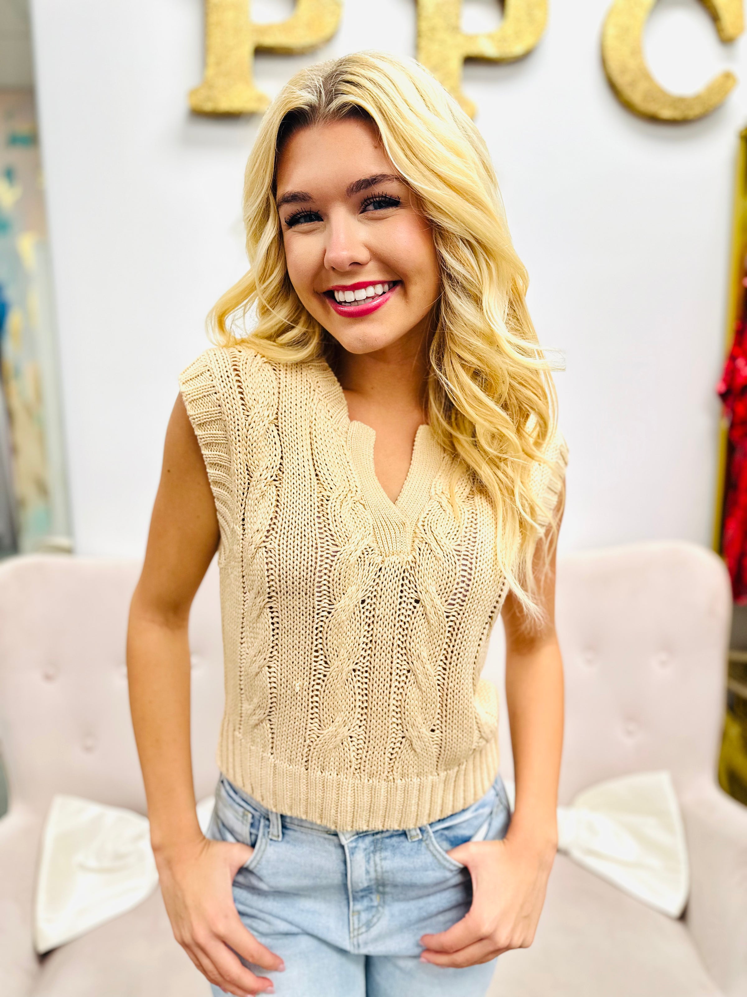 Wrap yourself in cozy charm with our cable knit sweater vest. Perfect for layering and adding a touch of warmth to any outfit, this versatile piece is a must-have for your wardrobe. Stay stylish while staying comfortable!