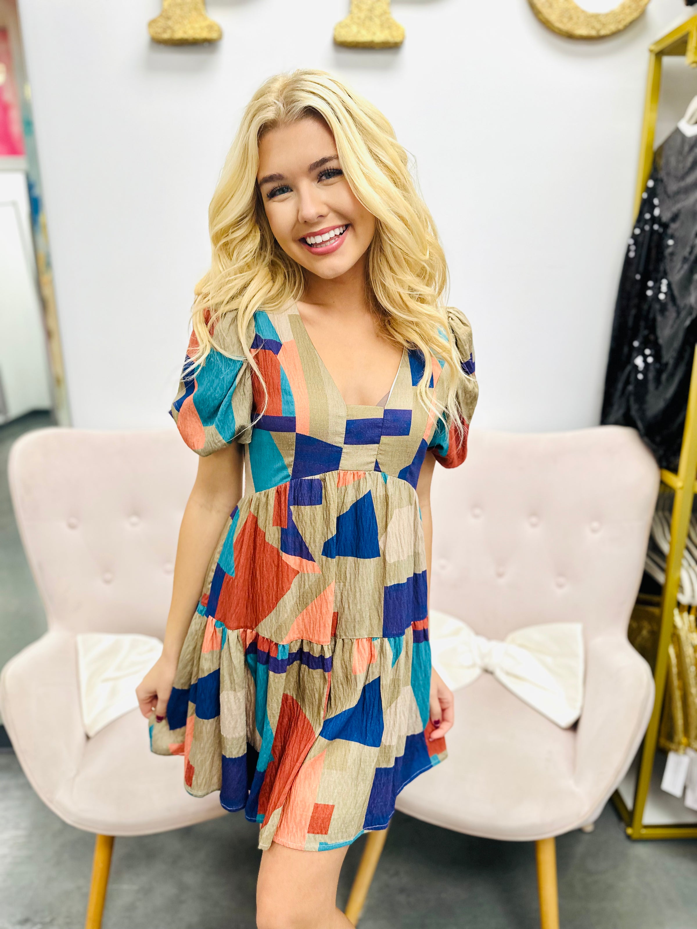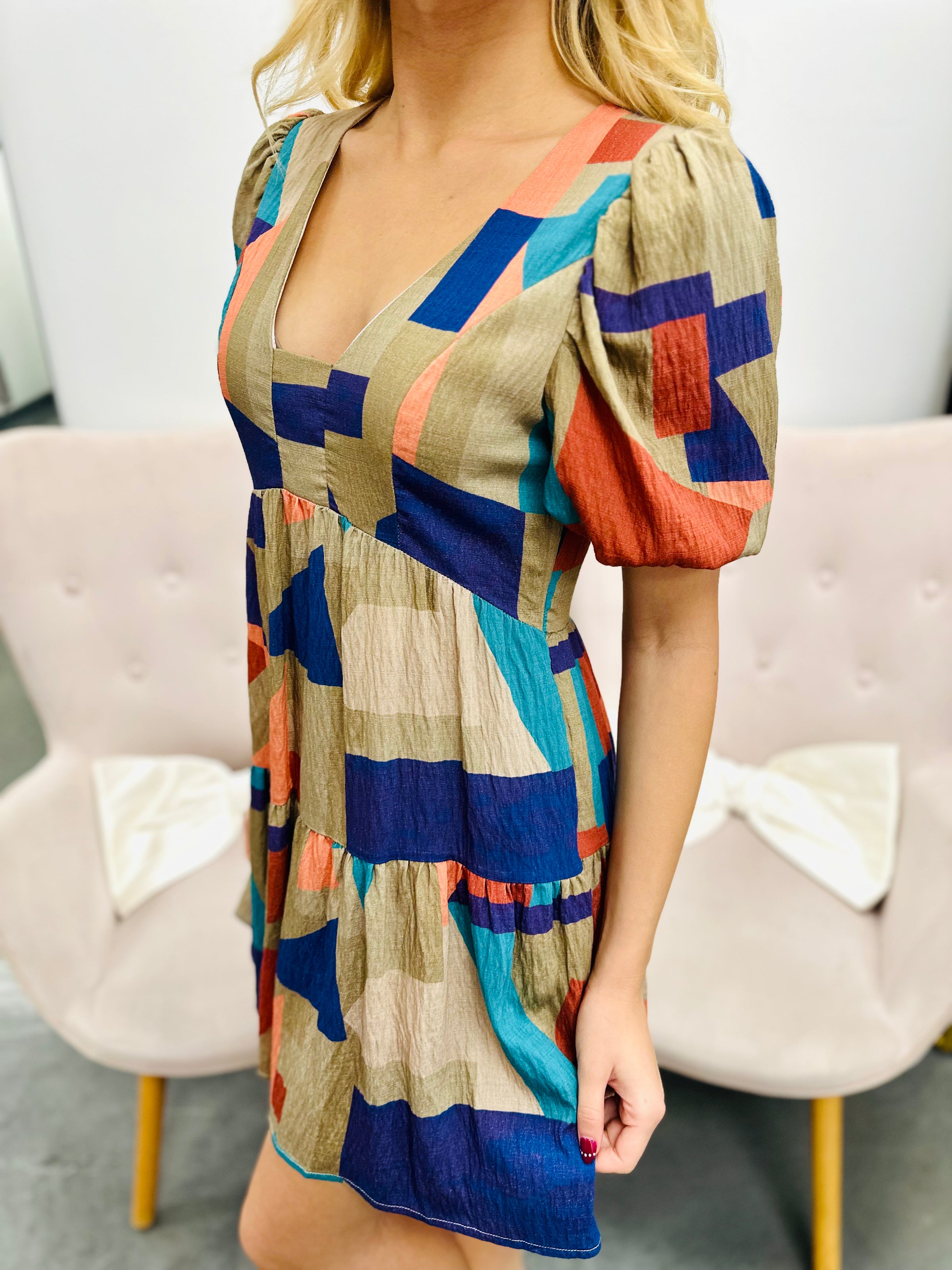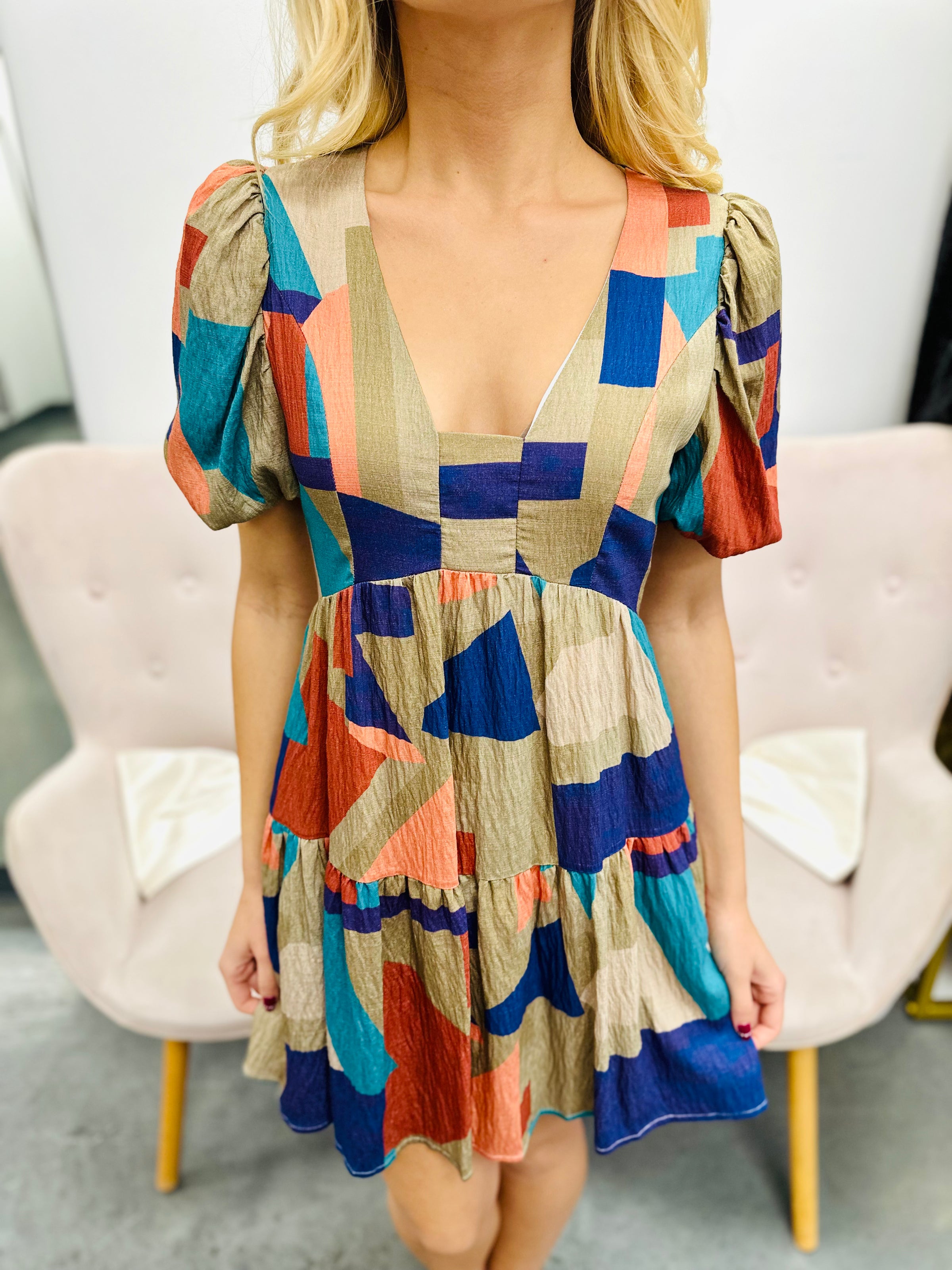 This abstract printed puff sleeve dress is a stylish and versatile addition to your wardrobe. The unique print adds visual interest while the puffed sleeves add a touch of drama. Made with high-quality materials, this dress is comfortable and durable. Elevate your look with this statement piece.