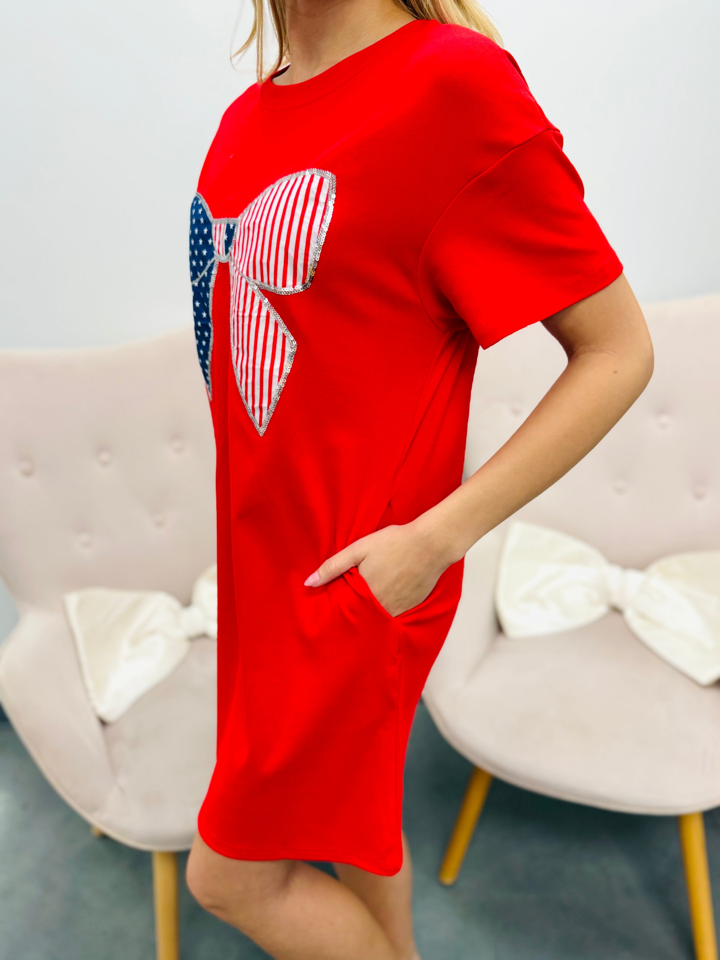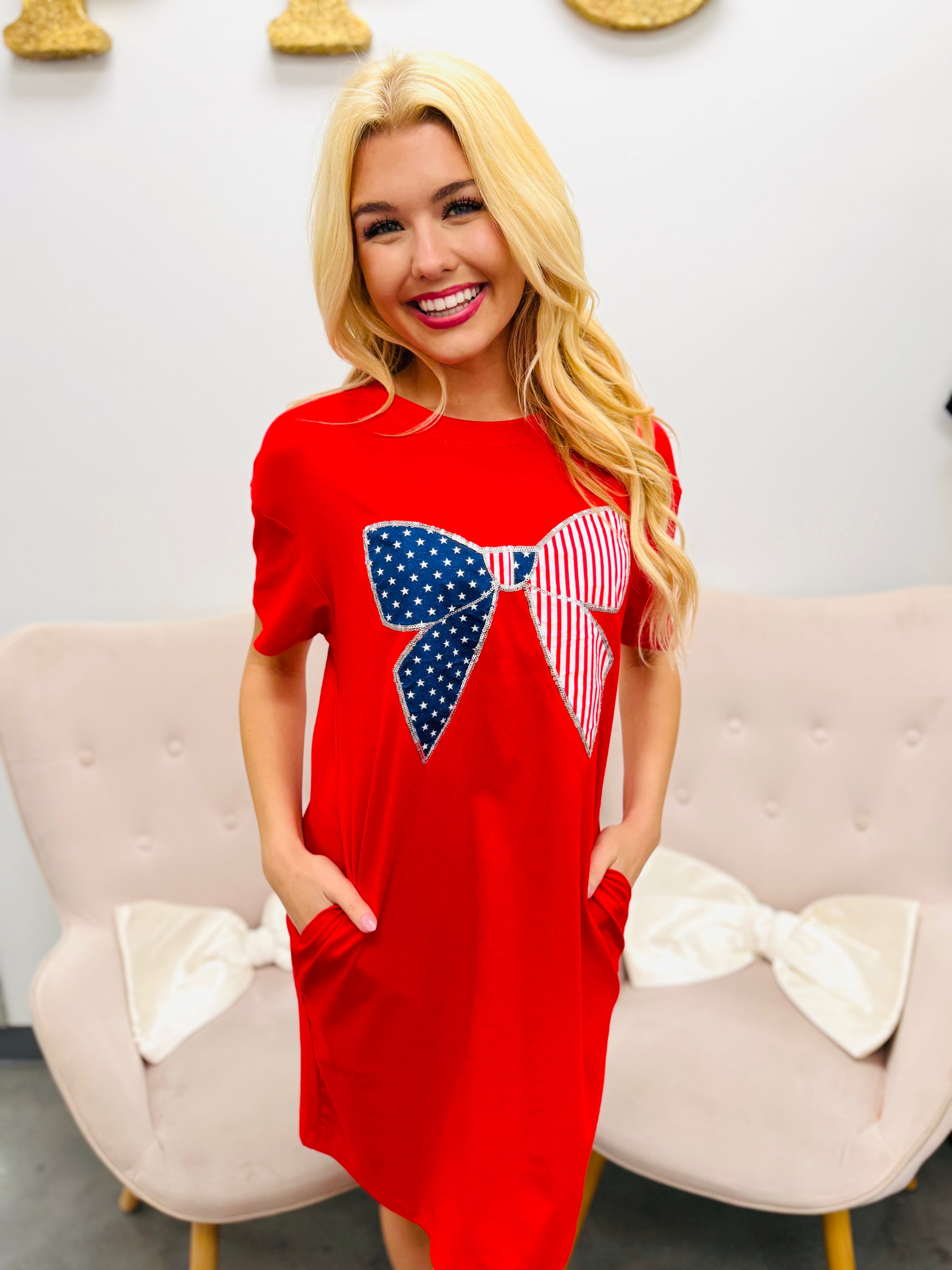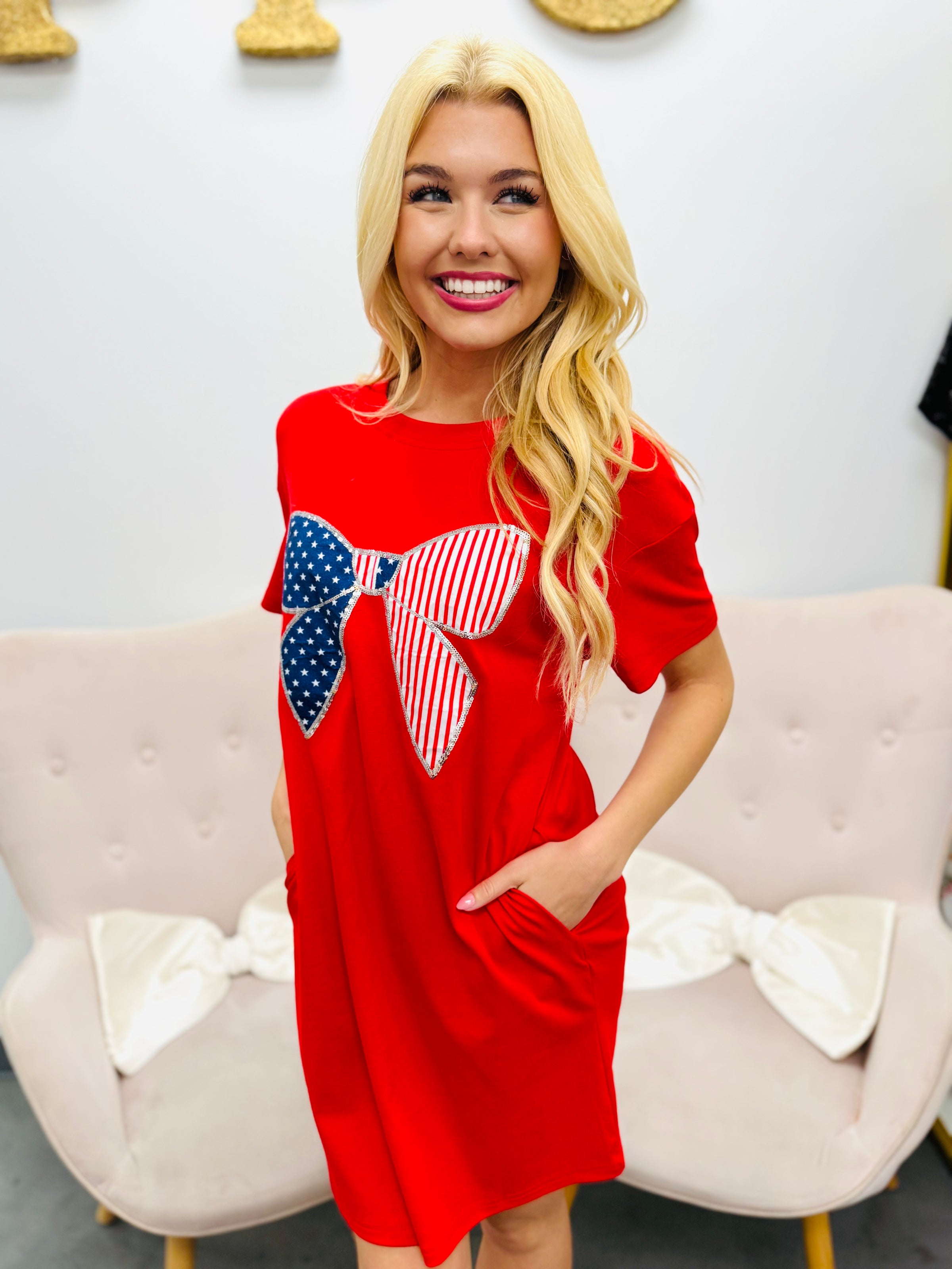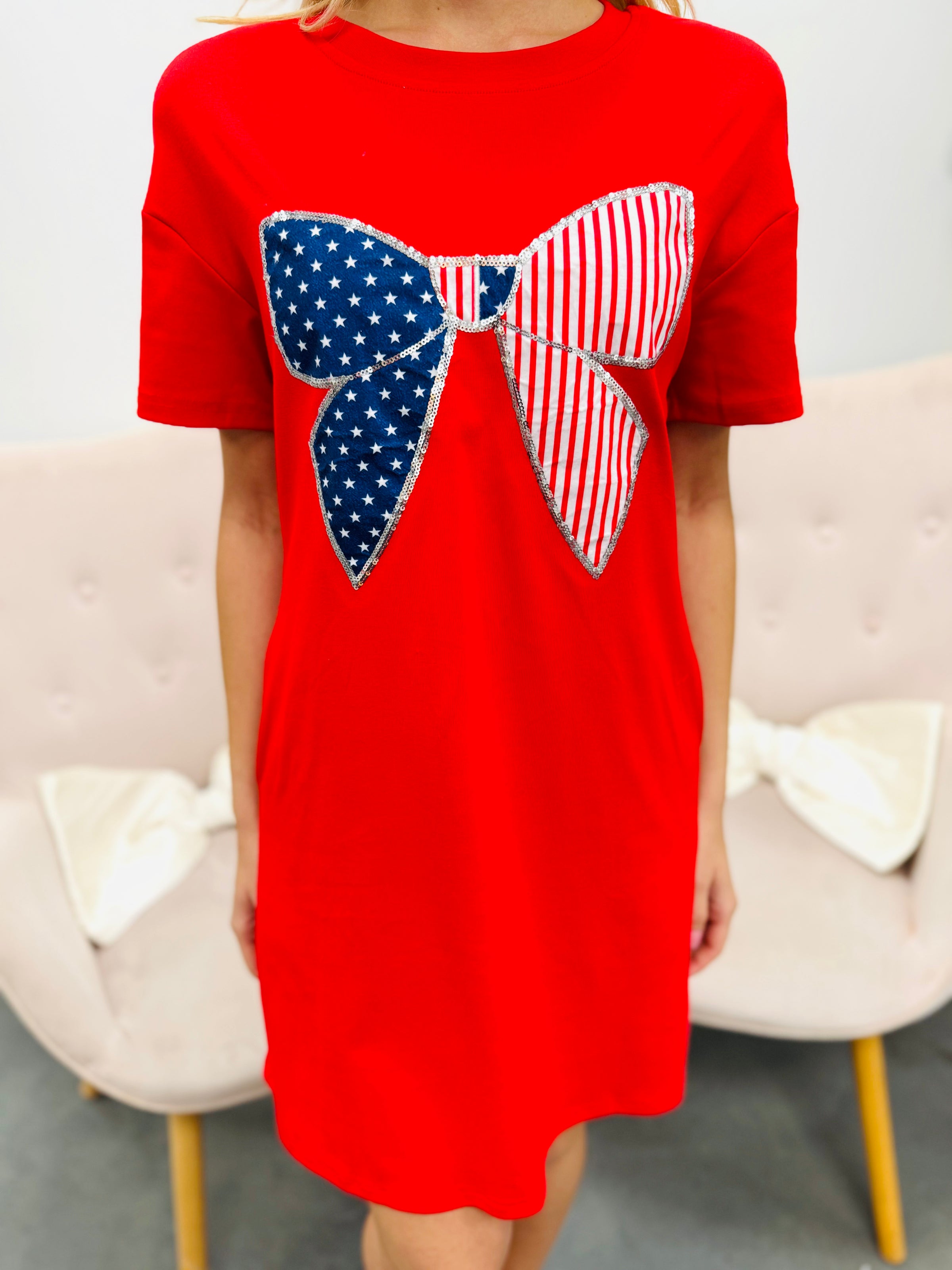 Classic, festive, and made for celebrating. The bold red silhouette keeps things simple while the oversized bow brings the star of the show — a patriotic patchwork design that adds the perfect all-American touch.