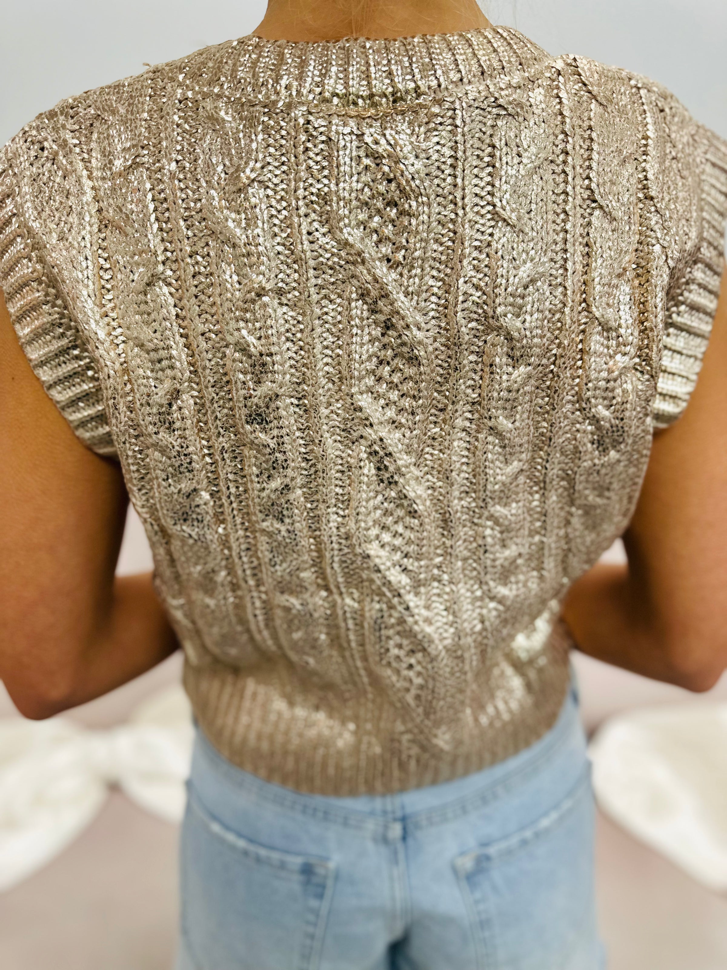This sleeveless cable knit metallic crop sweater brings sparkle and charm to your wardrobe. Its cozy knit texture paired with shiny metallic threads adds a playful edge while keeping things light and stylish. Perfect for layering or showing off your favorite high-waisted pieces, it’s a fun way to shine day or night.
