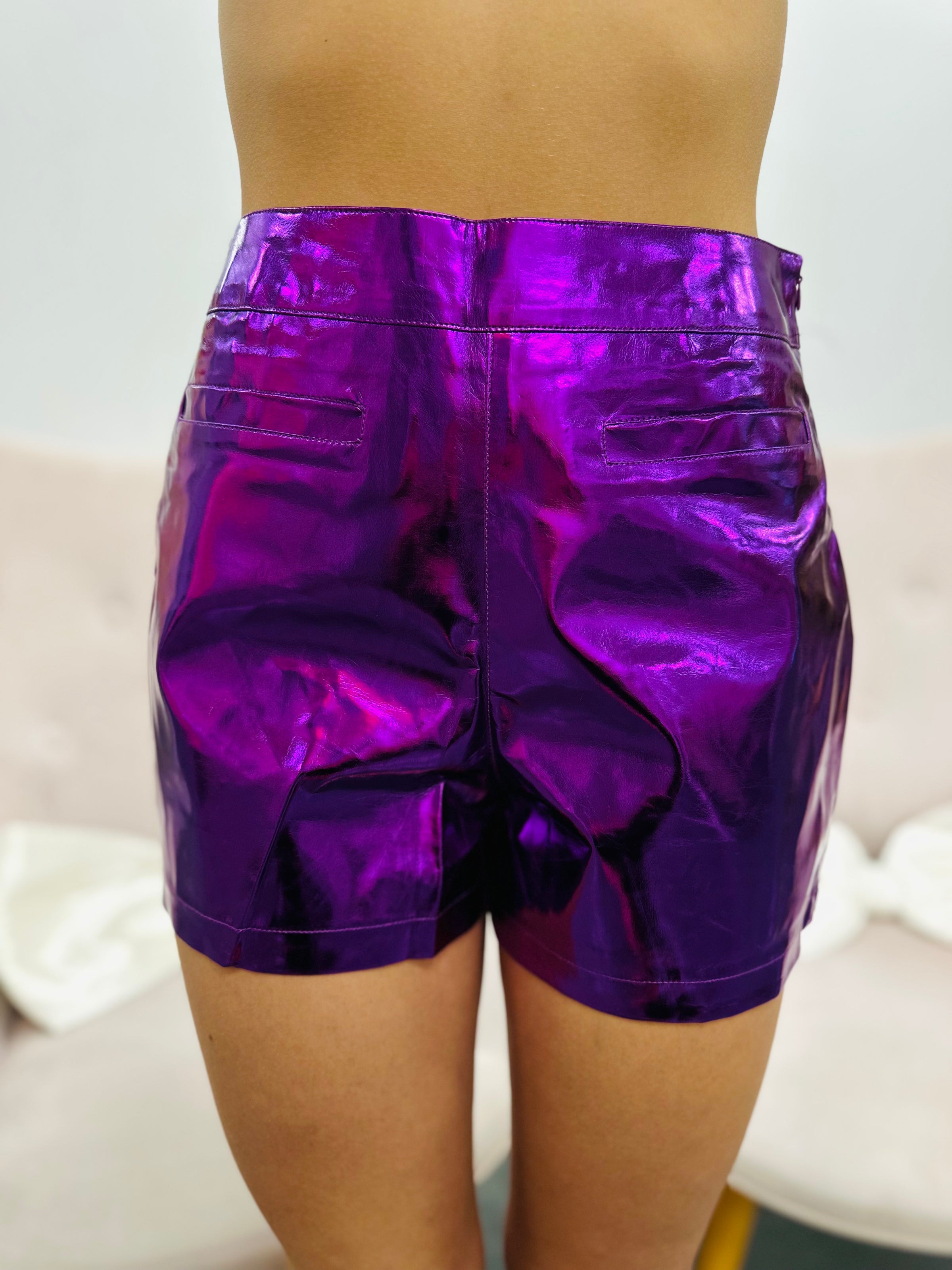 These classic flat-front shorts shine bright with their high-gloss pink metallic finish. Made from vegan leather, they bring edgy style without compromise. A side concealed zip keeps things smooth, and faux front pockets add a flirty touch. The non-stretch fabric ensures a crisp, structured fit—perfect for making a bold, playful statement wherever you go!