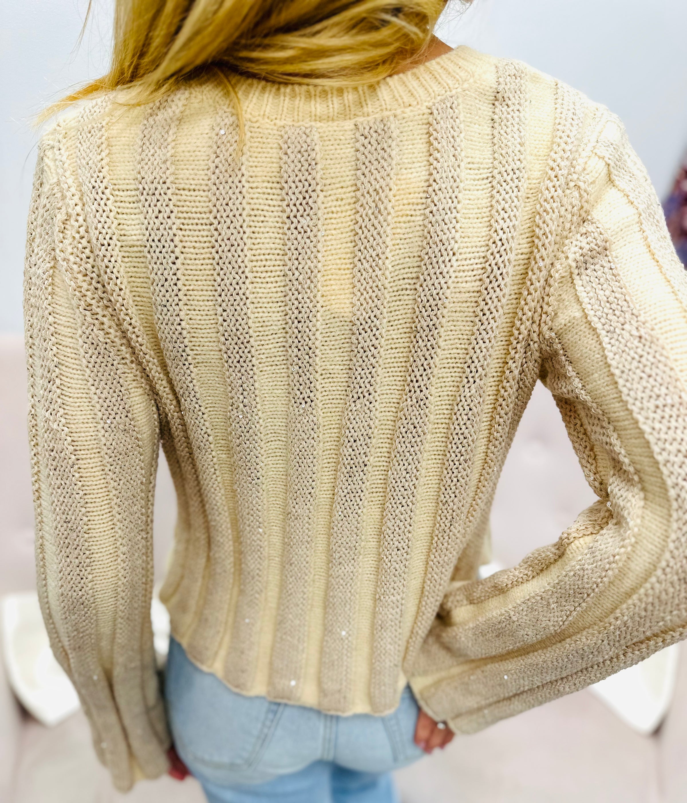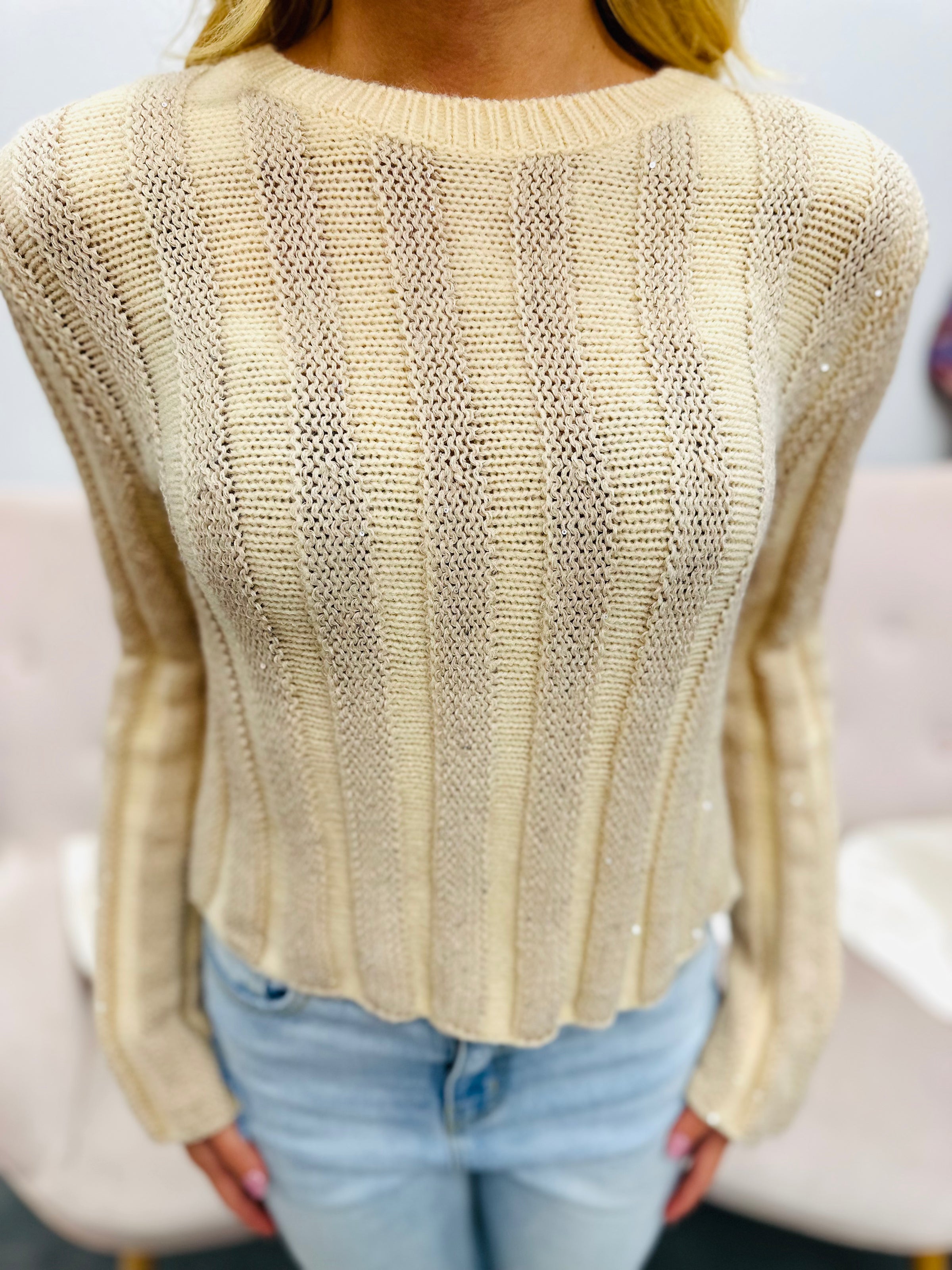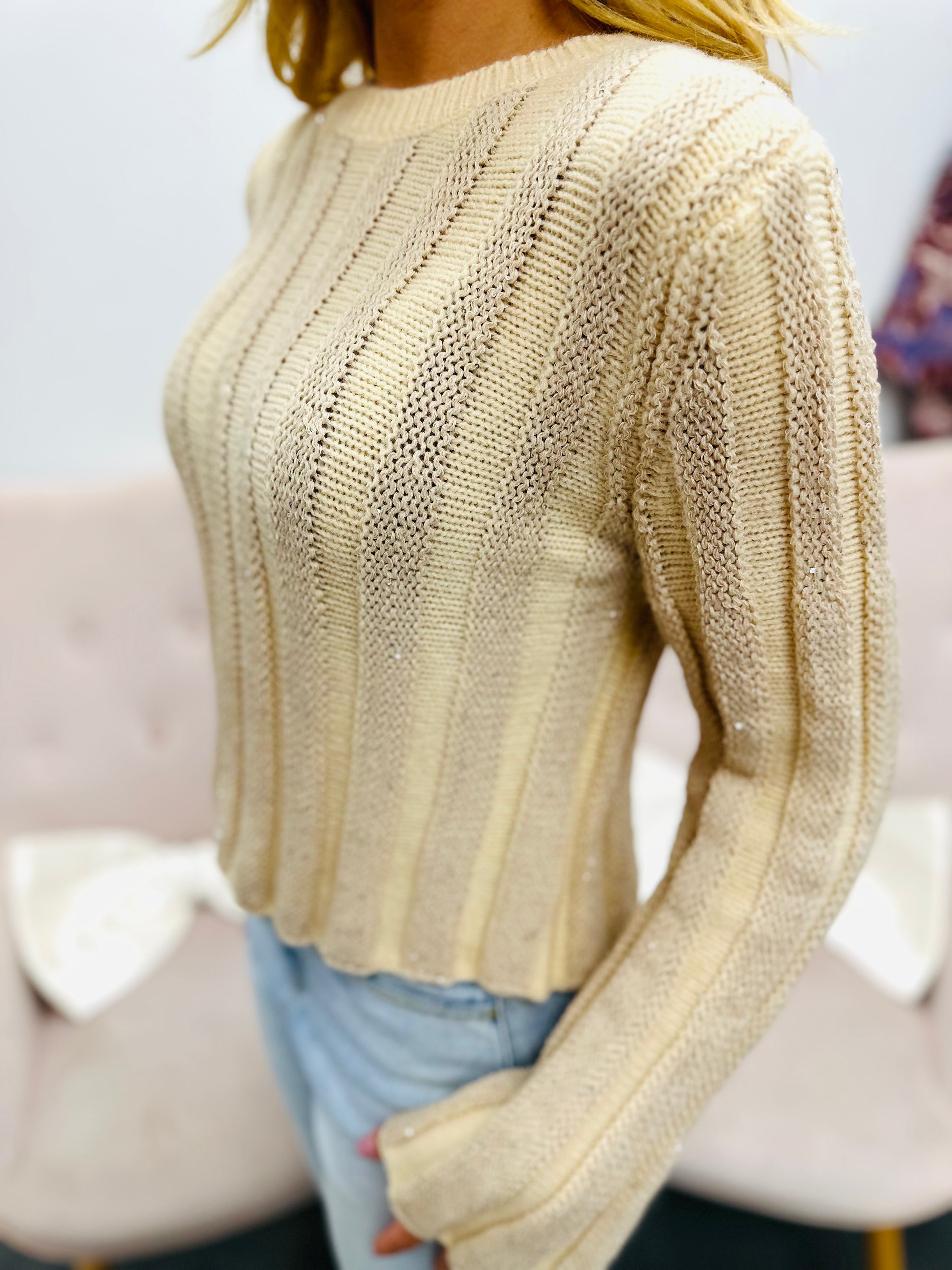 This cozy top features a soft rib-knit texture sprinkled with subtle sequins that add just the right amount of sparkle. Vertical tonal stripes in warm neutral shades create a flattering silhouette. With a comfy round neckline trimmed in ribbing and long, flirty bell sleeves, it’s perfect for effortless style and playful movement. Just pull it on and get ready to turn heads!