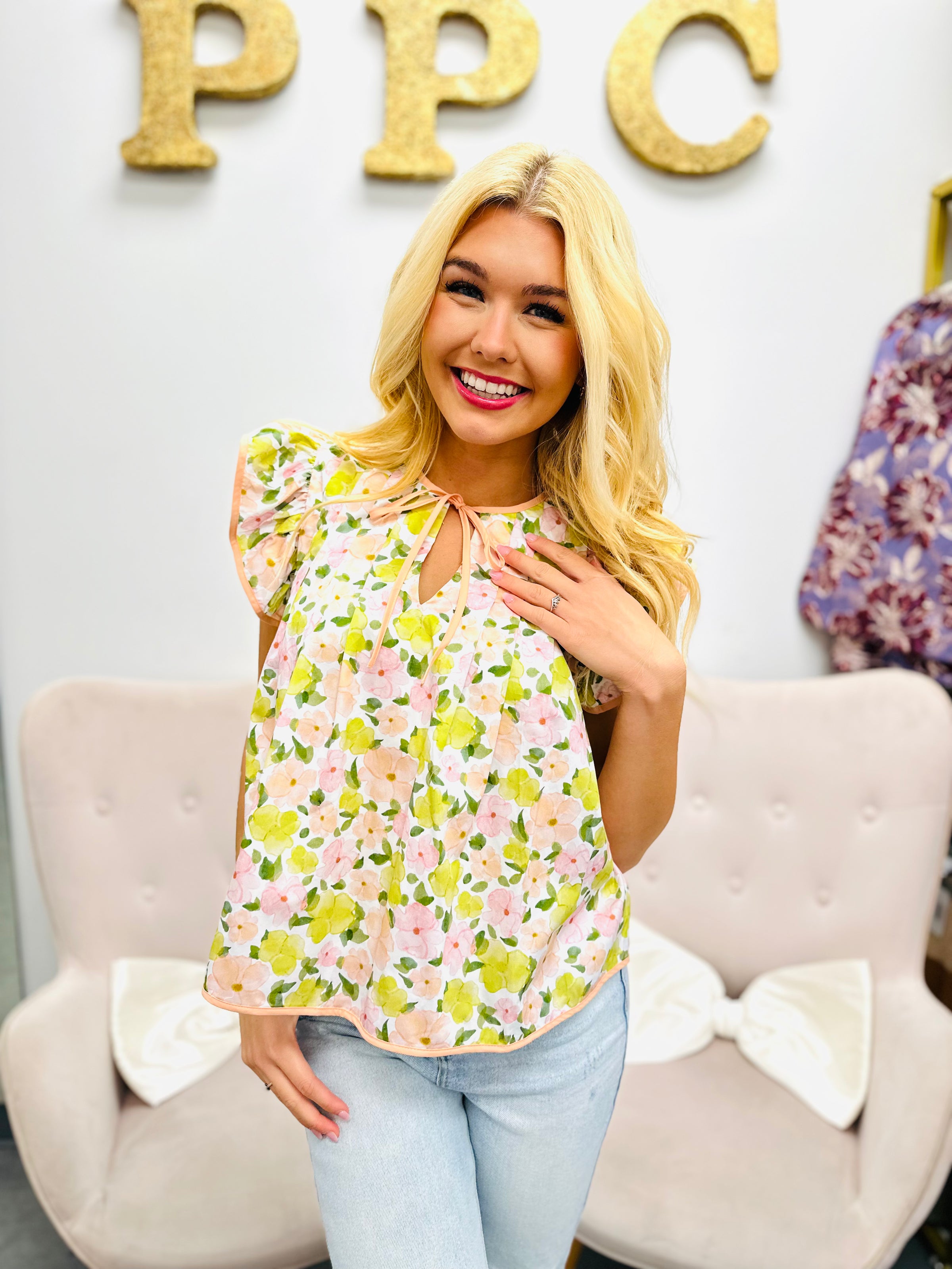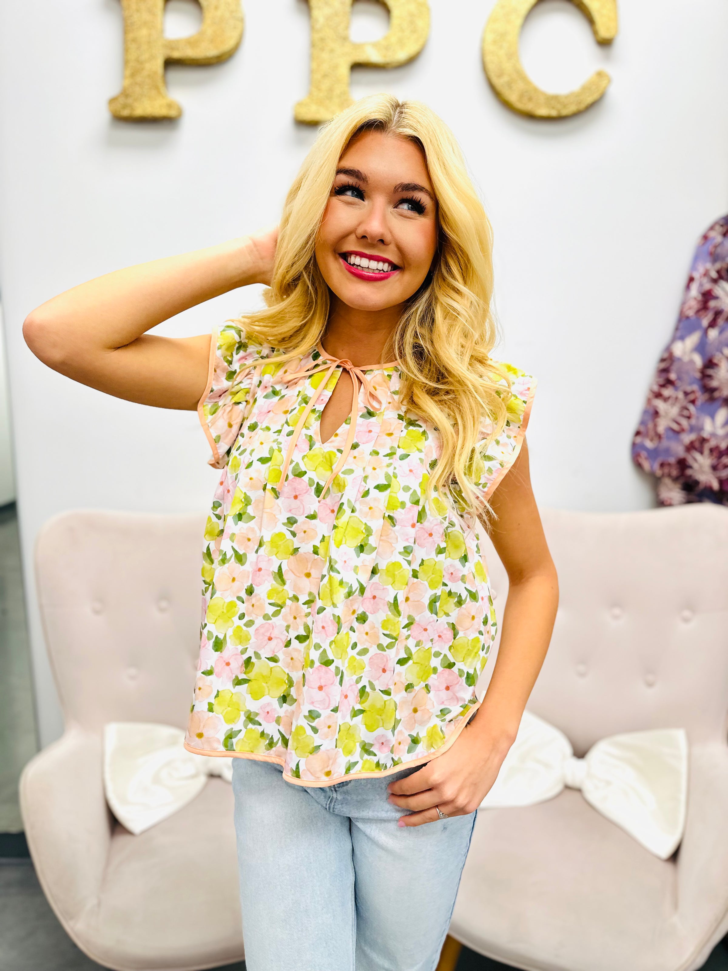 This playful sleeveless blouse brings charm with its delicate floral print on crisp cotton poplin. Contrast piping accents the neckline, sleeves, and hem, making every detail pop. The classic split V-neck with a sweet tie closure adds a flirty touch, while ruffle cap sleeves and pin-tuck details at the front yoke enhance its feminine flair. Fully lined for comfort and style.